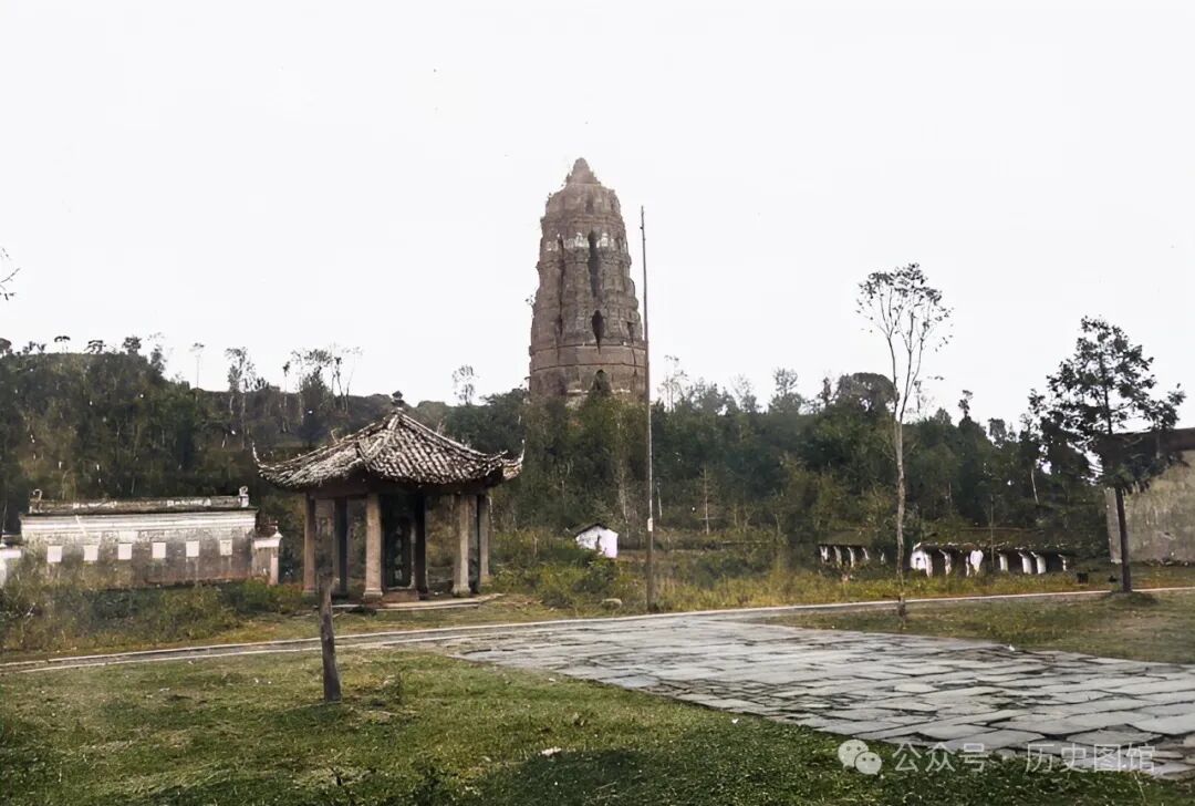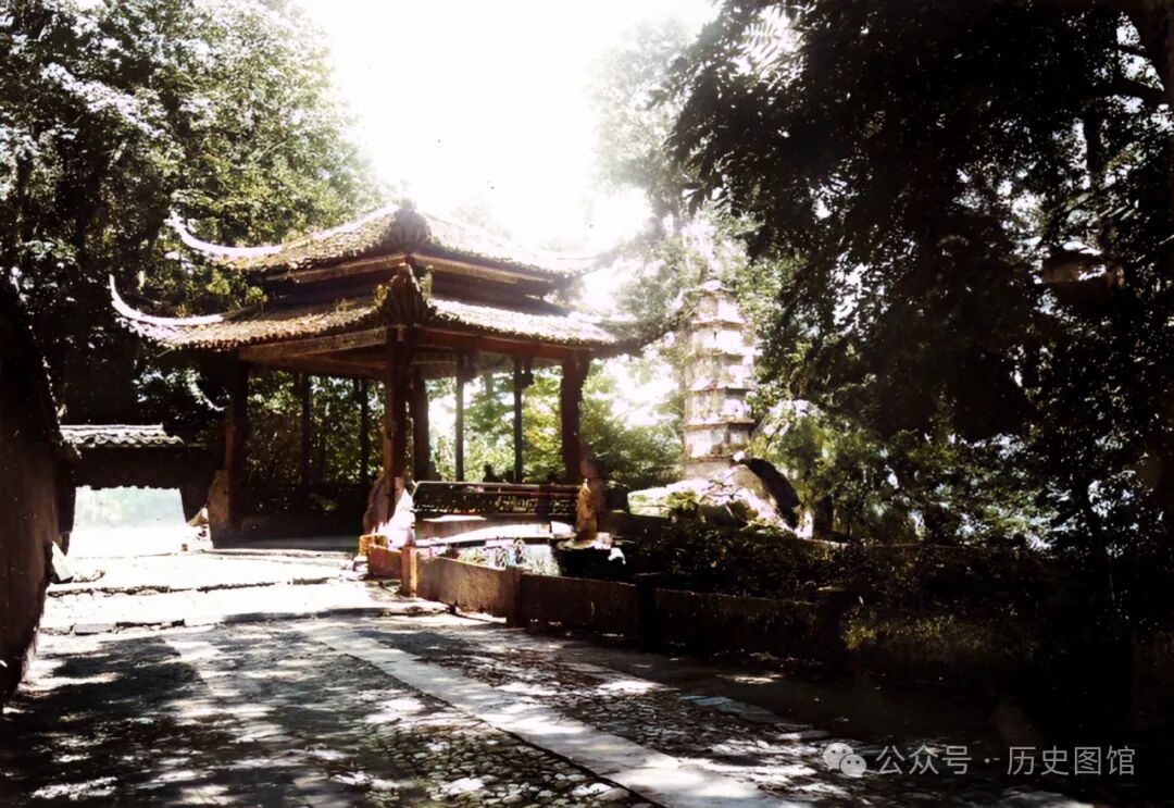 照片中这座四角亭子叫“春淙亭”,亭子建在“回龙桥”上,桥下小溪名叫“龙泓涧”。正对桥头有一座古塔,名曰“理公塔”。照片中,亭子四周环境清幽。