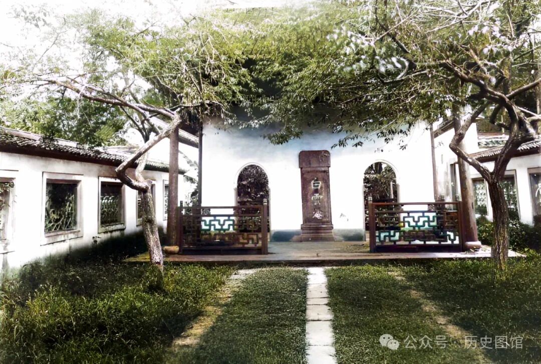这座建筑叫“白云庵”,宋代称"翠芳园",位于雷峰塔西侧。清光绪年间重建。照片中,一座碑亭掩映在绿树丛中,碑上刻“白云庵”三个大字。真有“一庵深锁白云中”的奇妙意境。