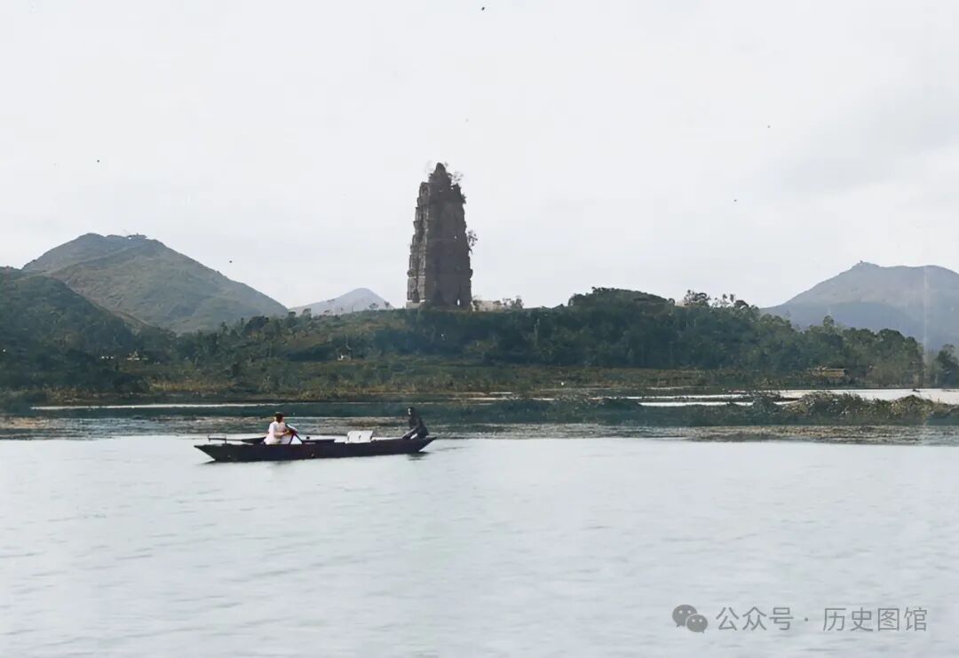 每当傍晚,霞光照射在塔身,犹如镀上一层金光。雷峰塔出名,与白娘子传说有关。照片中,游人划着小船,观看雷锋夕照盛景。1924年,雷峰塔轰然倒塌。2000年,重建雷峰塔。