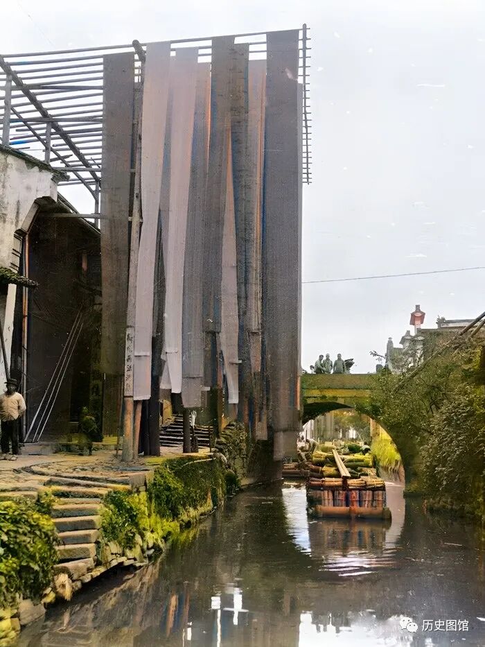 这是当时位于通江桥附近的“九和染坊”,染好的布匹高高挂在架子上。远处,一艘小船载着货物正在通过通江桥。如今,只剩下一个地名了。