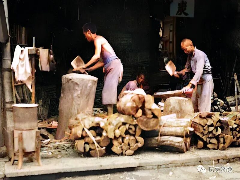 这是一家专门制作木炭的商铺,几名工匠正在处理一批木材。用砍刀把木头制作成同样长短的木条,捆扎在一起,再制作成木炭。