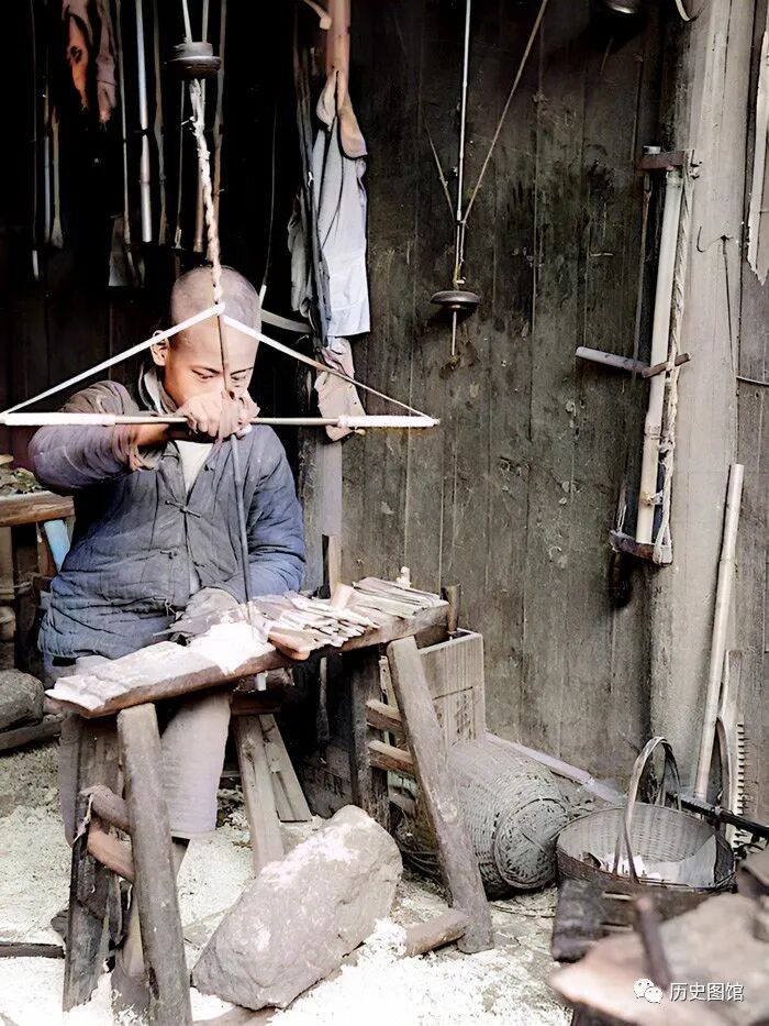 这是杭州街头,一家木匠铺里的年轻工匠。他手中操作的是一把木钻,正在木器上打孔。