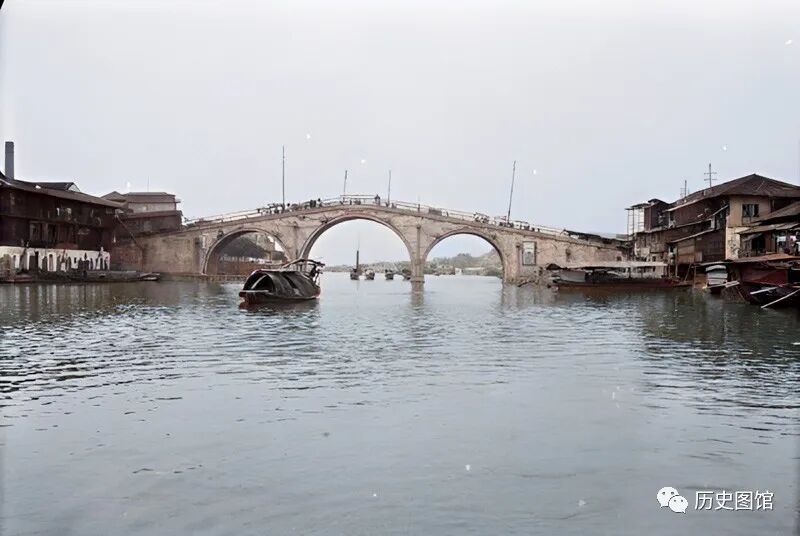 这座三孔石拱桥,就是杭州著名的拱宸桥,它是古运河杭州终点的标志。长桥卧波,小船来往穿梭,两岸是古色古香的江南建筑,就好像一幅艳丽的水彩画。