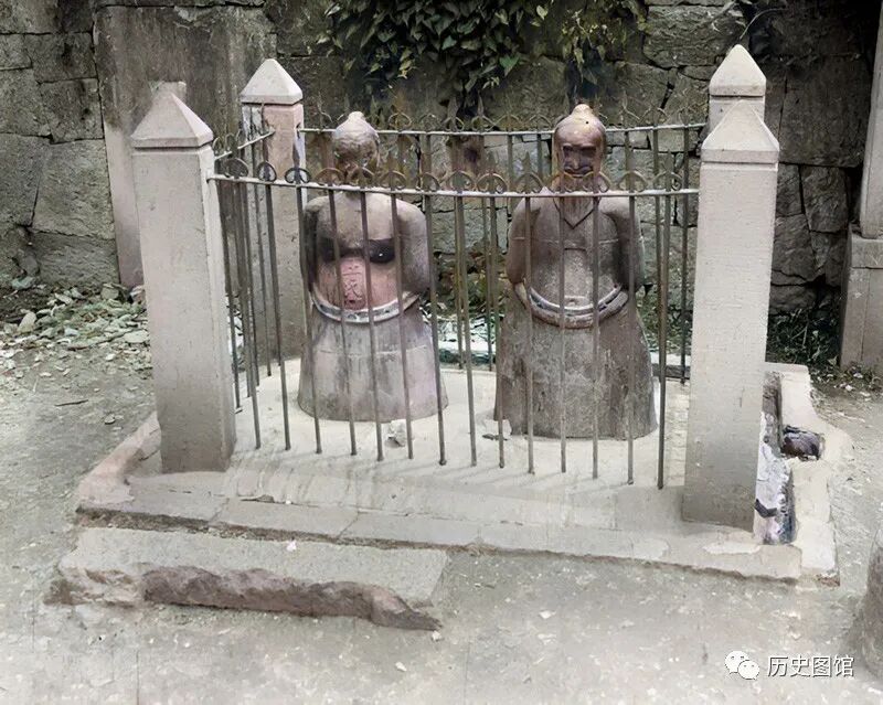 这是岳王庙里秦桧与其夫人王氏的跪像。宋朝时期,岳飞被秦桧夫妇残害。两人在被铸成铁人,铁栅栏内反剪双手,赤身长跪于岳坟前,千秋万代受世人唾骂。