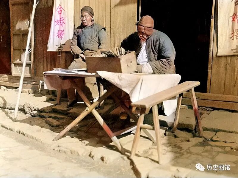 这是1917年杭州街头一位占卜先生,在路边支起简易的桌子,桌子上摆着卦签。