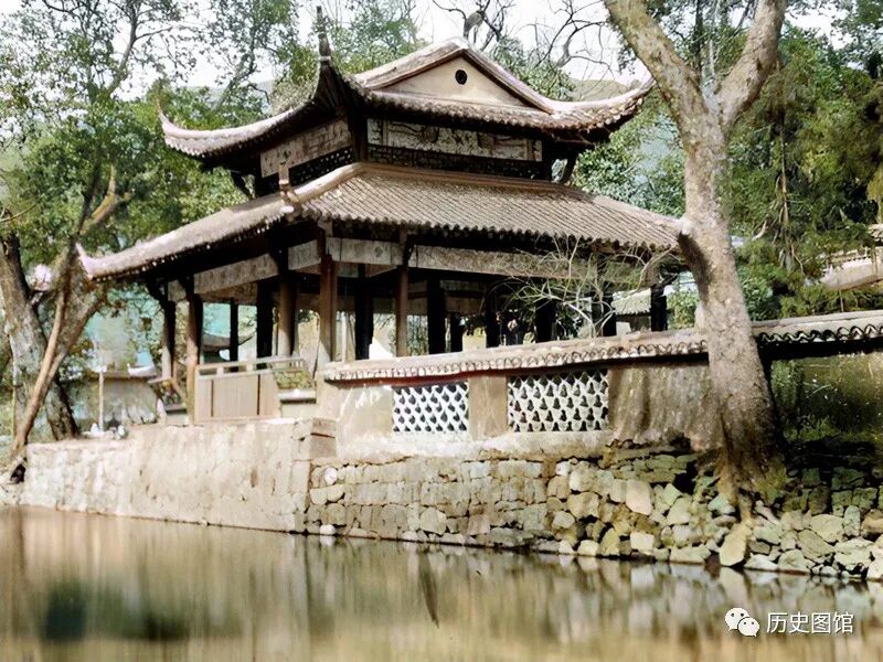 这是1917年杭州灵隐寺一角。在冷泉溪前,有一座四角亭子叫“冷泉亭”。站在这里,能看到斜对面灵隐寺的山门。