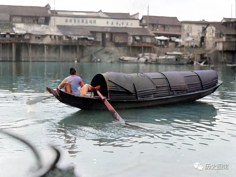 这张照片,拍摄于杭州凤山门附近。一名船工正驾驶着小船穿过河道,河水清澈,河岸上是具有江南特色的民居。