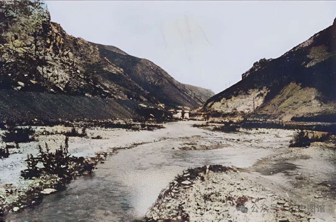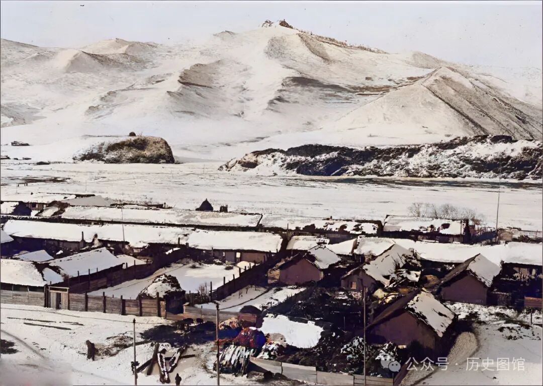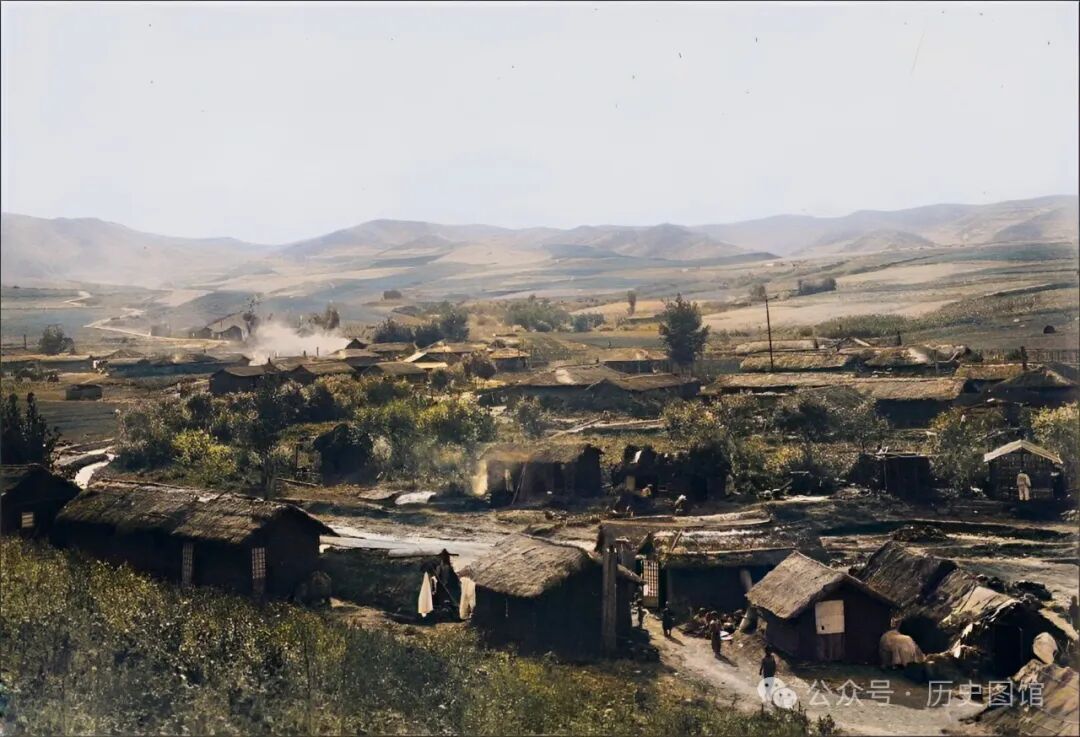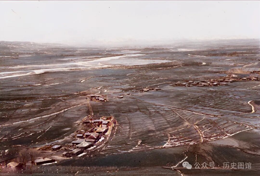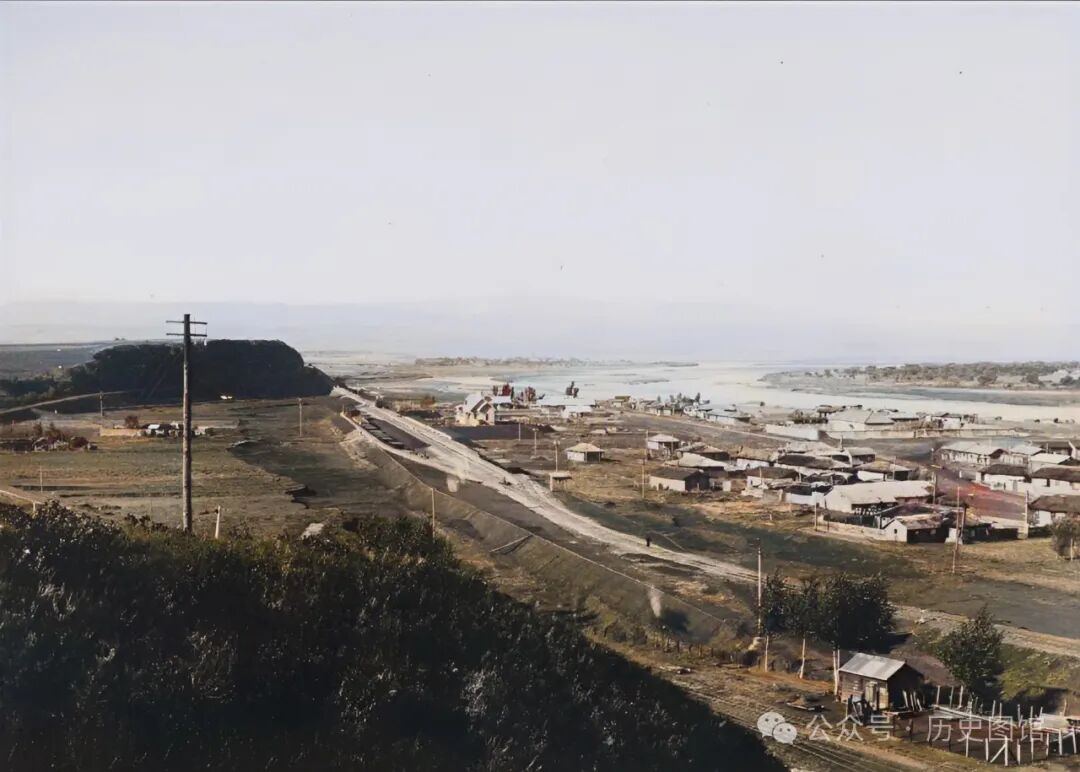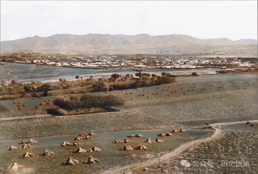 30年代,位于龙井镇境内的头道沟景象。照片中是大片农田,中间分布着一些村镇。远处一条大河蜿蜒曲折,流向远方。如今,头道沟面貌发生了翻天覆地的变化,看上去比过去漂亮多了。