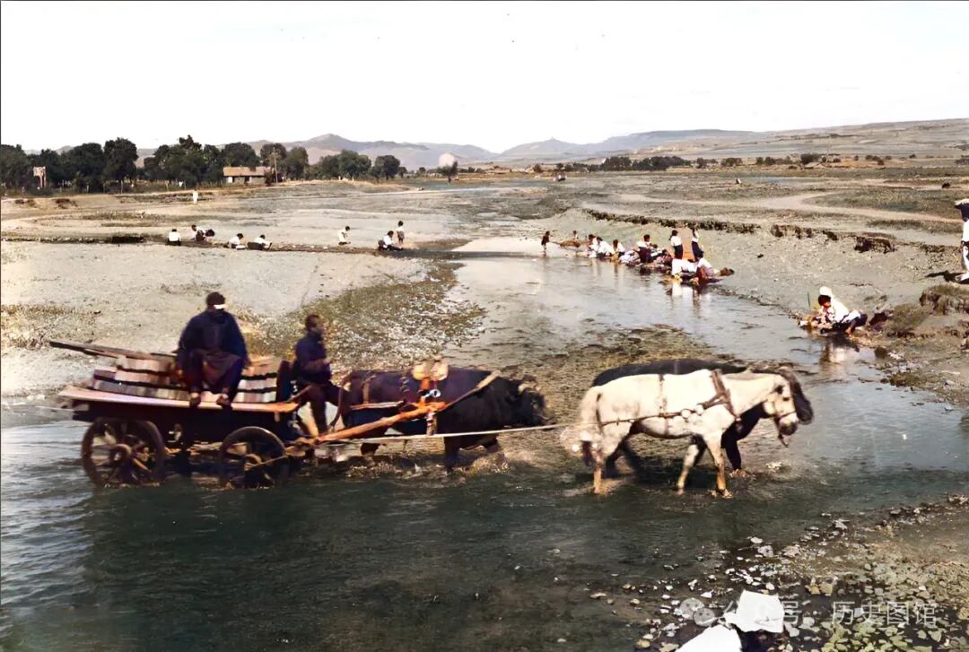 这张照片,拍摄于延吉郊外。一条大河,河水退去,露出了宽阔的河床。当地一些女子下到河底洗衣服。两名男子赶着马车从涉水过河,车上装满了砖块。河堤之上,能看到有一些村庄,掩映在绿树丛中。