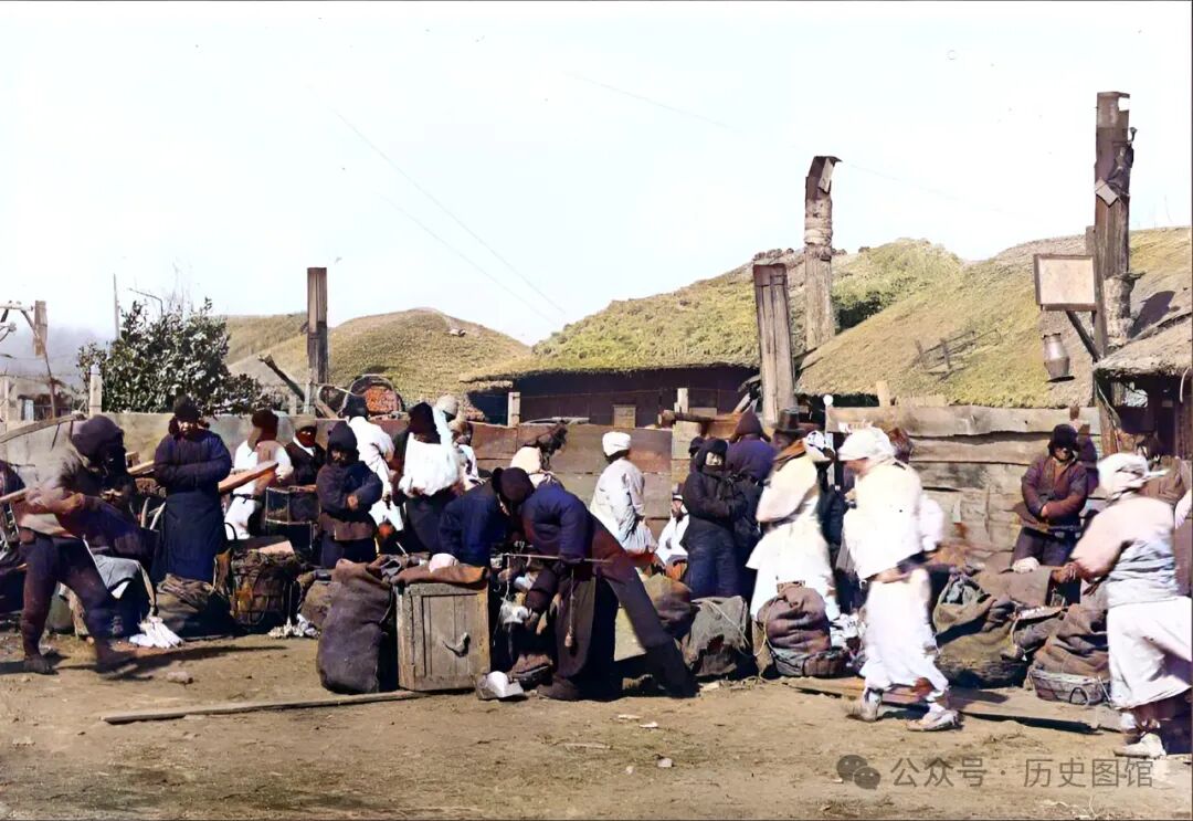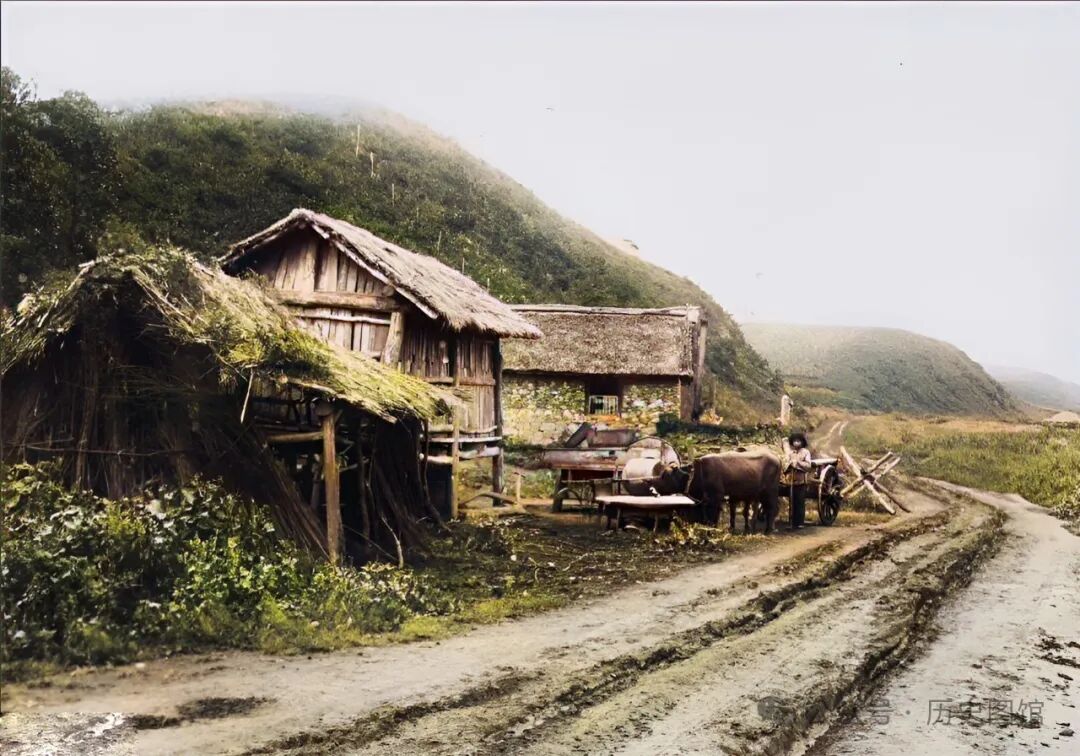 这是位于珲春的北岔子附近景象。几栋民房,还有一座磨坊建造在一条大路拐弯处。道路上有深深的车辙痕迹。路旁有一座碾盘,一头黄牛拉着碾盘上的石磙转圈,将谷物碾压成粉末。