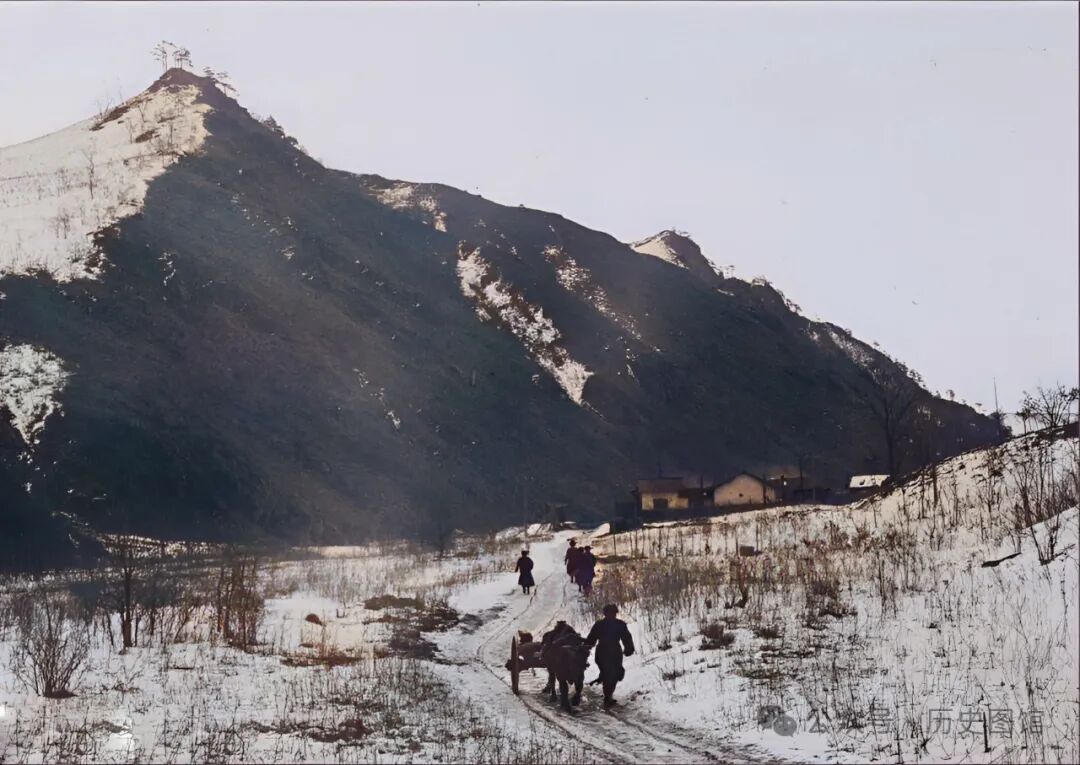 照片中这座山,位于龙井境内老头沟的天宝山。这座山原名叫红石砬子,慈禧太后赐名为“天宝山”。这里山形险峻,山间多巉岩峭,岩石中富含多种金属矿产。照片中,积雪还没有融化,当地人赶着马车从山脚下走过。