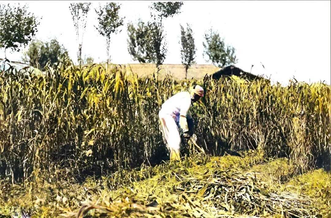 30年代,位于延吉的一处田地里,一名农民正在割粟。地里的粟又一人多高,这名农民拿着镰刀将其收割。看到这样的画面,不仅让人想起,过去北方人收割小麦的情景。
