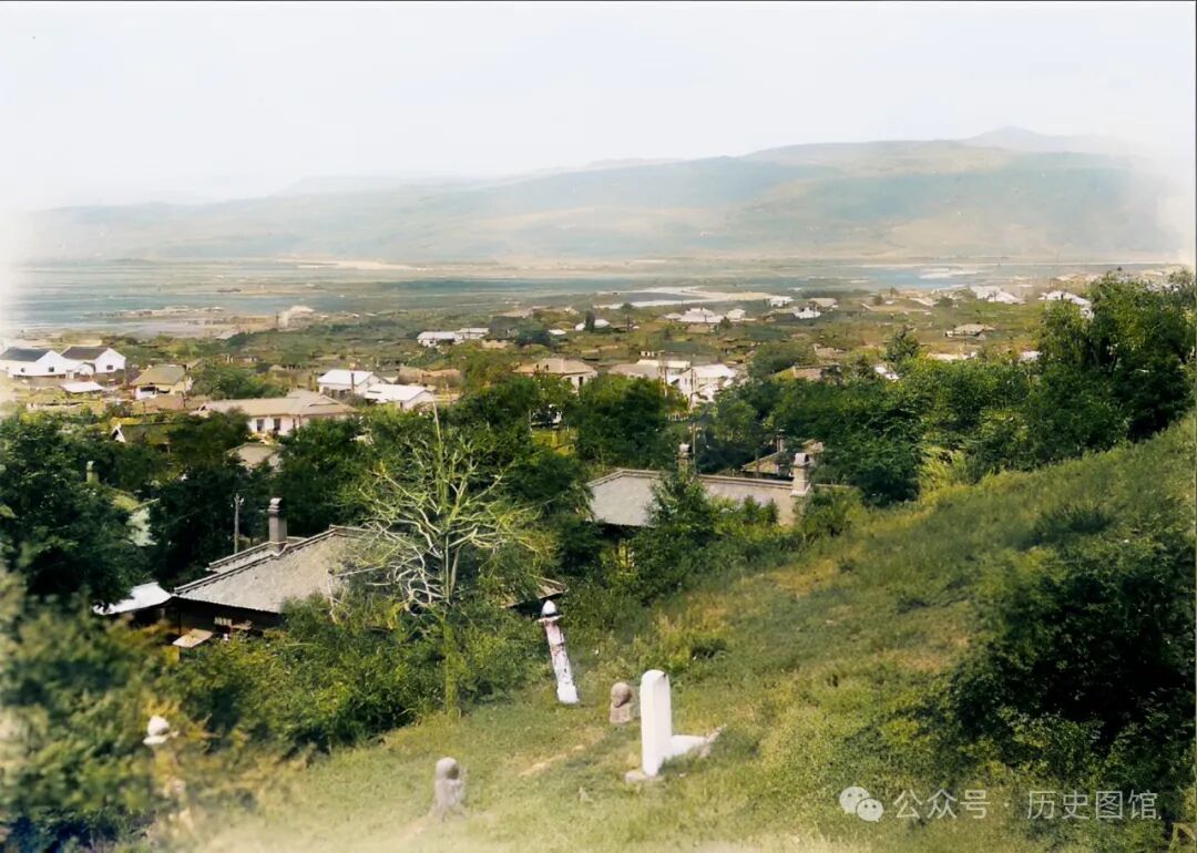 30年代,延吉东南会宁中朝边境景象。山坡上,有一处墓地,墓碑的石头立柱清晰可见。山脚下绿树丛生,一些欧式建筑掩映其中。两国边境内外景象迥然不同。