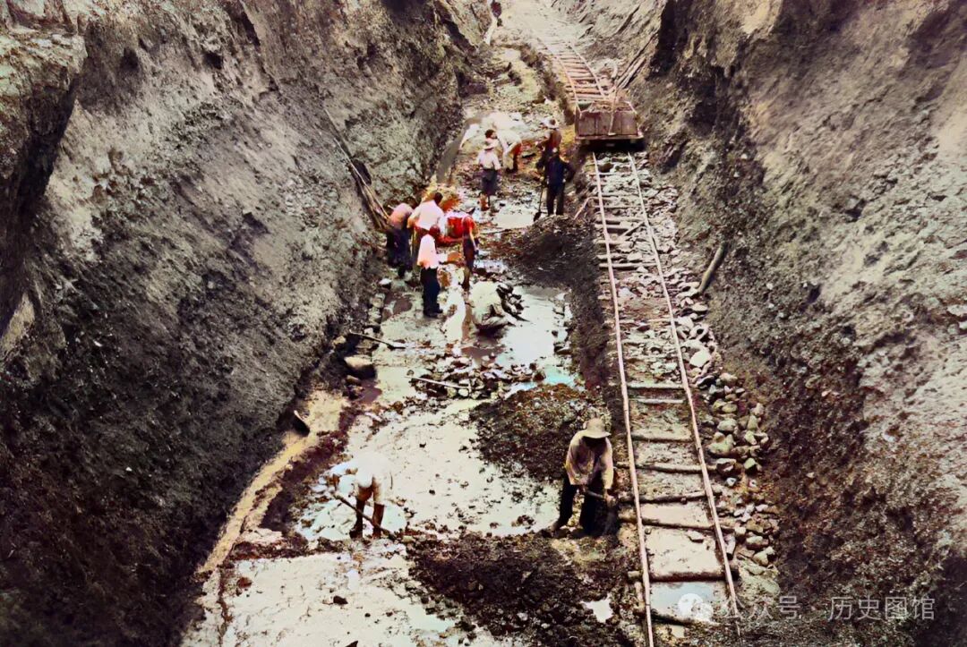 30年代,位于延吉附近北岔子的砂金采矿场。供热让你们正在矿坑中紧张地工作。坑底修建有可以运货的小火车道。