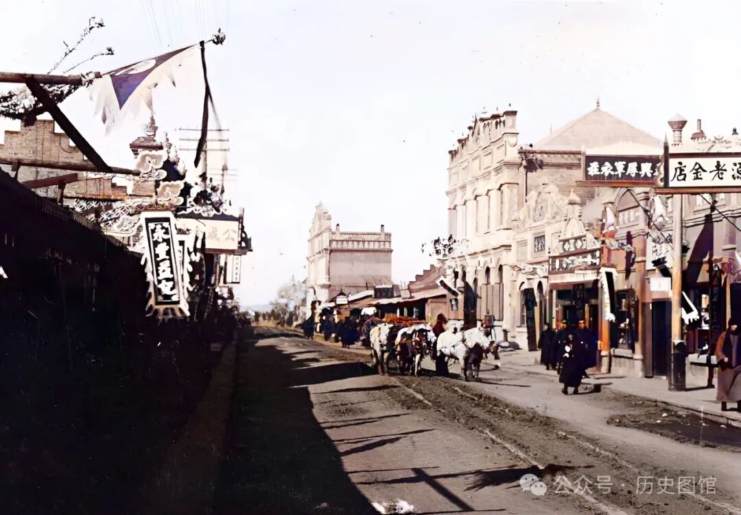 这是30年代延吉城内繁华热闹的大街——局子街。街道笔直一眼望不到尽头,两侧有不少欧式建筑,沿街门店都在开门营业,门头广告牌琳琅满目。