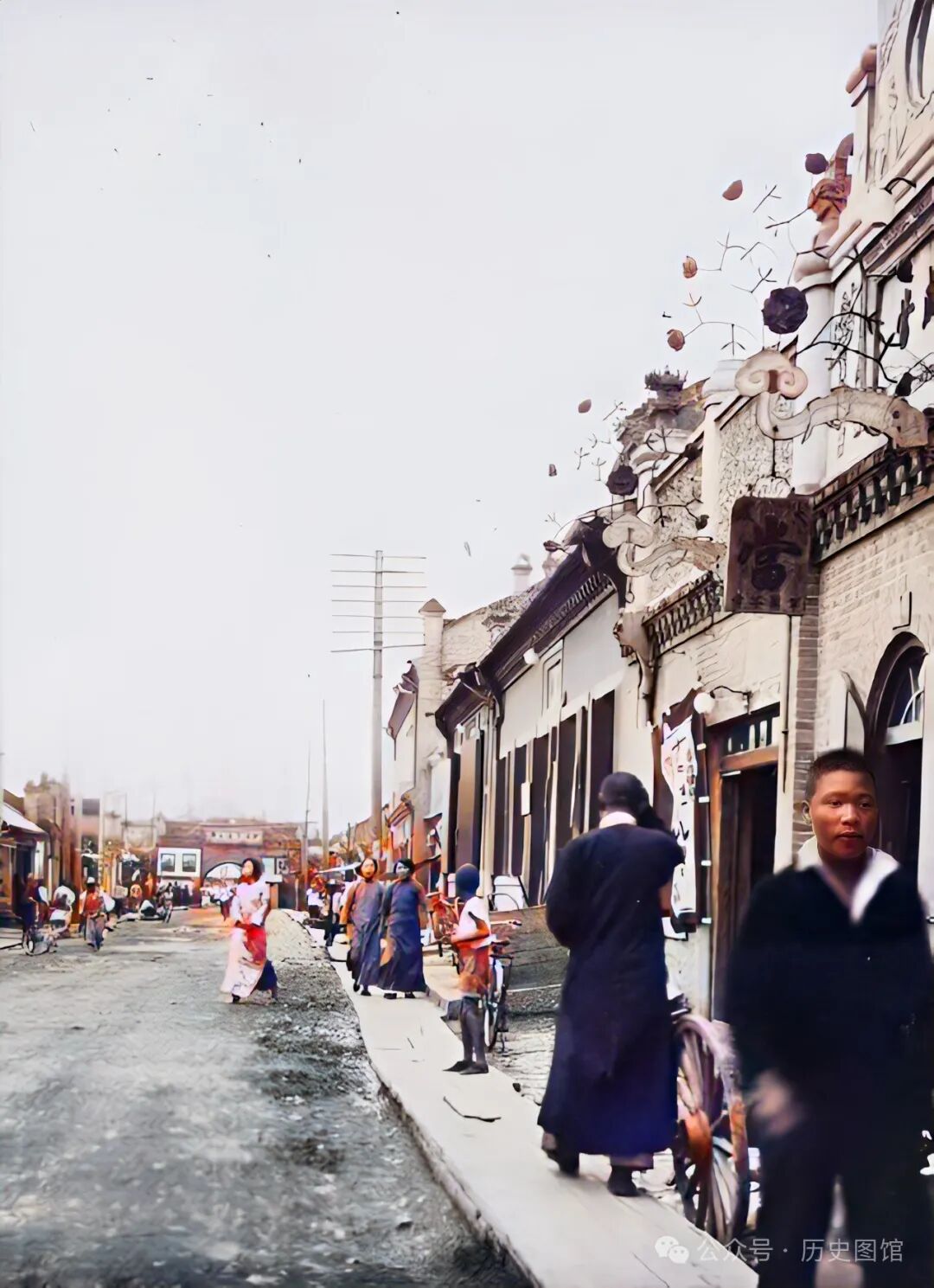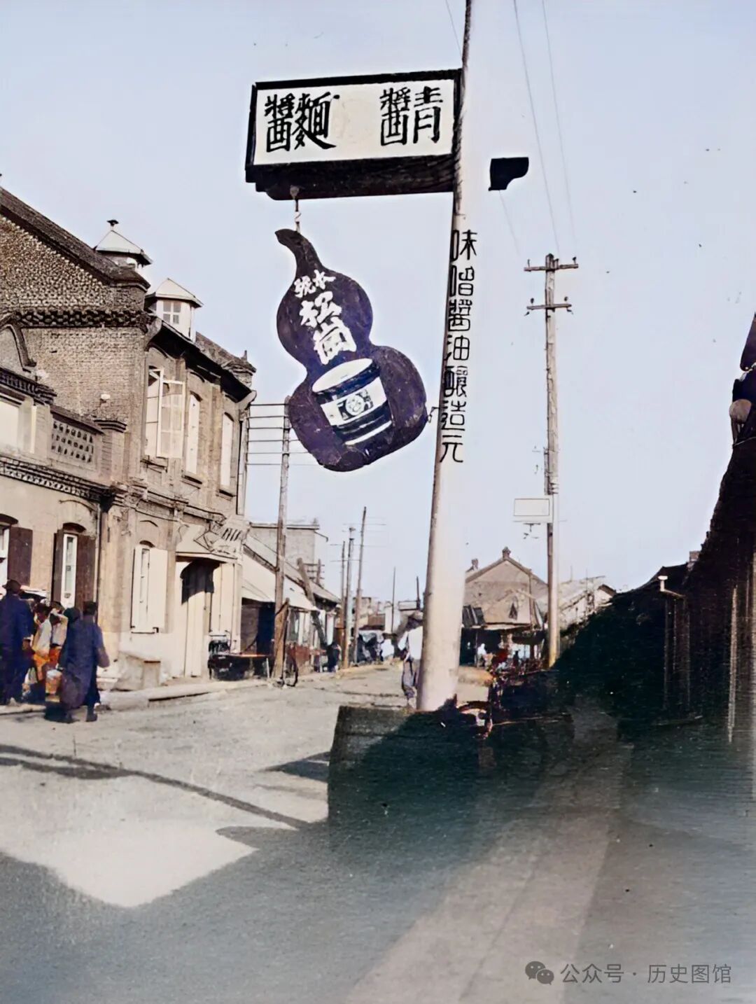 30年代,珲春城内一条街道上的景象。街边的电线杆上,悬挂着店铺经营的产品名称,有青酱、面酱、酱油等。牌子下还悬挂着一个葫芦状的招牌,街上有不少人在逛街。