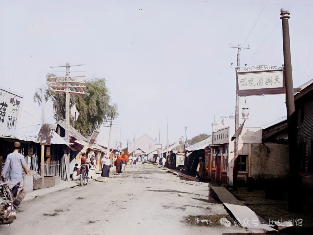 30年代,珲春城内一条街道上的景象。街道不是很宽,两侧建筑古色古香,临街店铺都在开门营业。门口的广告招牌琳琅满目。