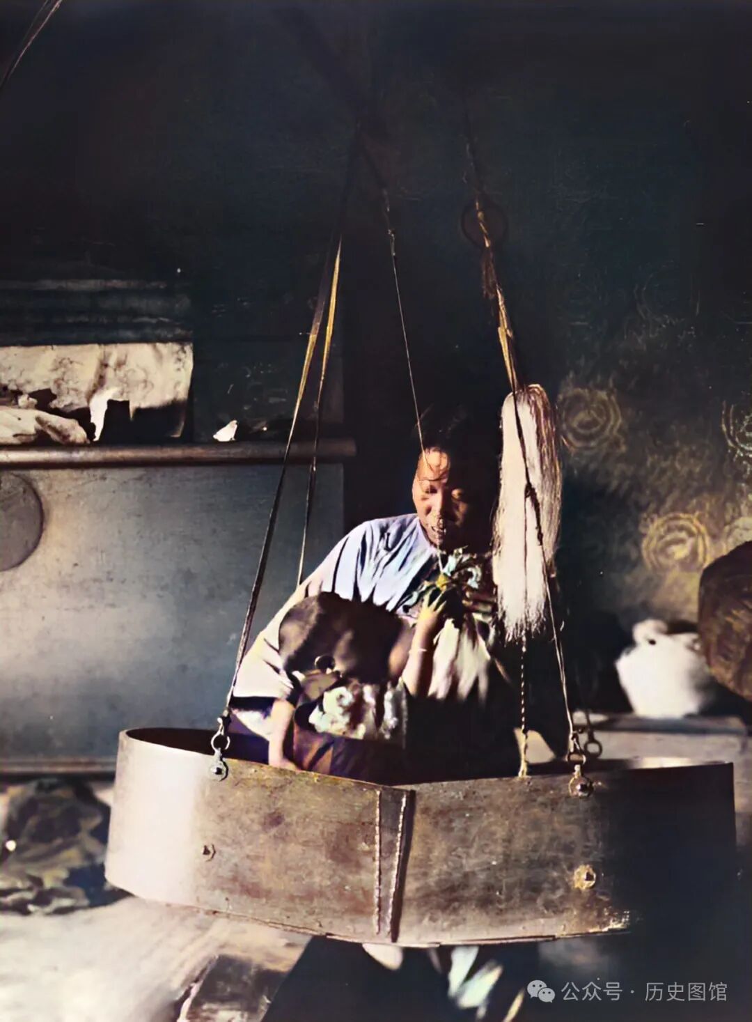 照片中,一名女子正在照看自己的孩子。孩子坐的摇篮很特别,用绳子吊在房梁上。有了这样的摇篮,这位母亲就能腾出手去干别的活。有人说,那时候的孩子真好养。