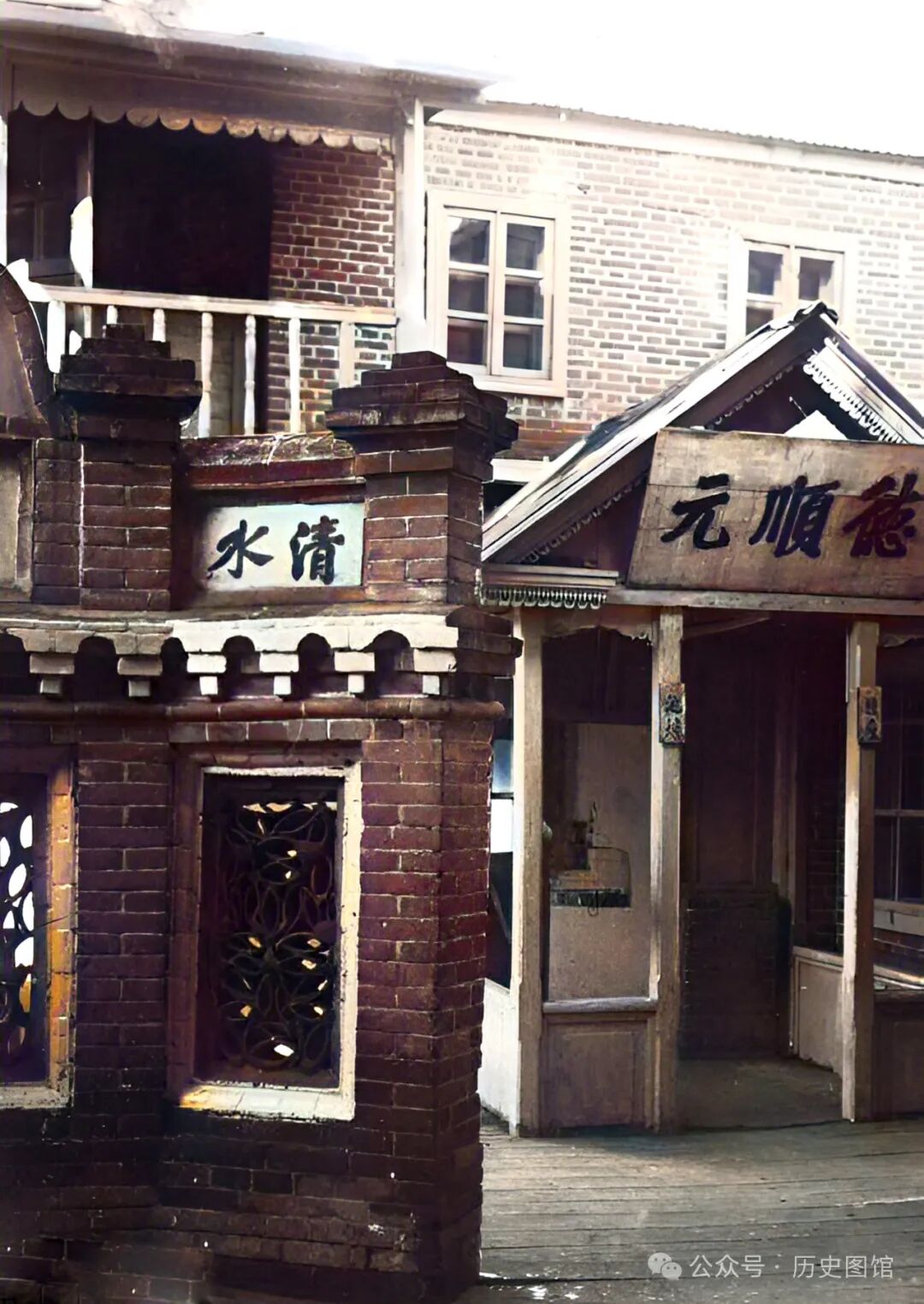 30年代,珲春城内一座澡堂子门前景象。澡堂子的名字起得很讲究“德顺元”,这个澡堂规模不小,有两层楼,地面铺着木地板。门口的墙头上有“清水”字样。