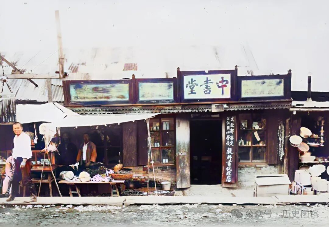 30年代,珲春街边一家店铺,门头上写着“中书堂”三个大字。原来,这是珲春当地的一家知名书店。门口的竖牌上,写着店内图书的种类。在这家书店门口,有一个路边摊,摊主好像是售卖水果的。