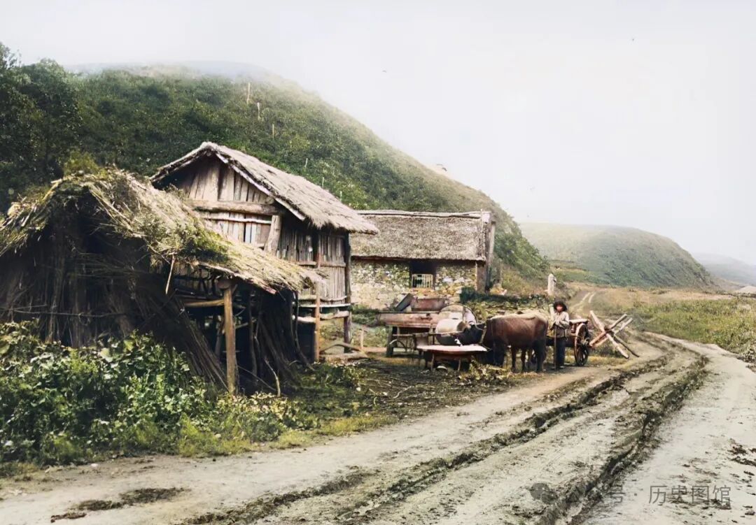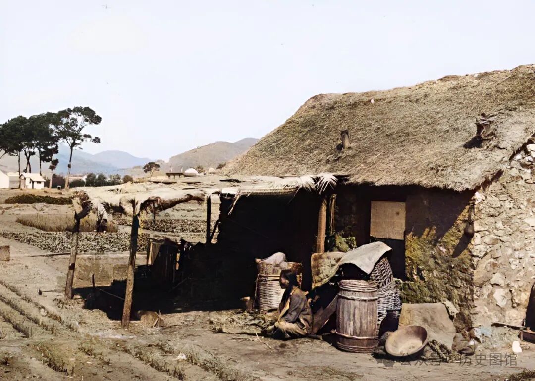 30年代,珲春乡下景象。一户人家的屋舍建在田地边,土石垒砌的草房。房前搭着遮阳棚,女主人坐在房前休息。