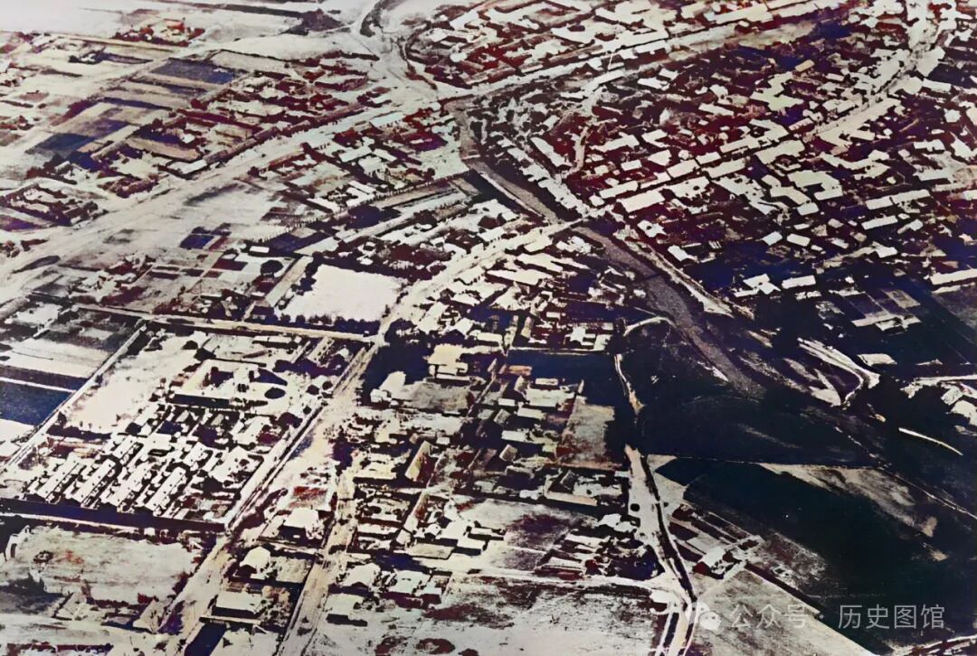 这是从空中俯瞰珲春城。30年代的珲春城,令人震撼。仔细看,珲春城墙清晰可见,城内外房屋鳞次栉比。珲春河,是图们江下游的最大支流,它穿城而过向西汇入图们江。