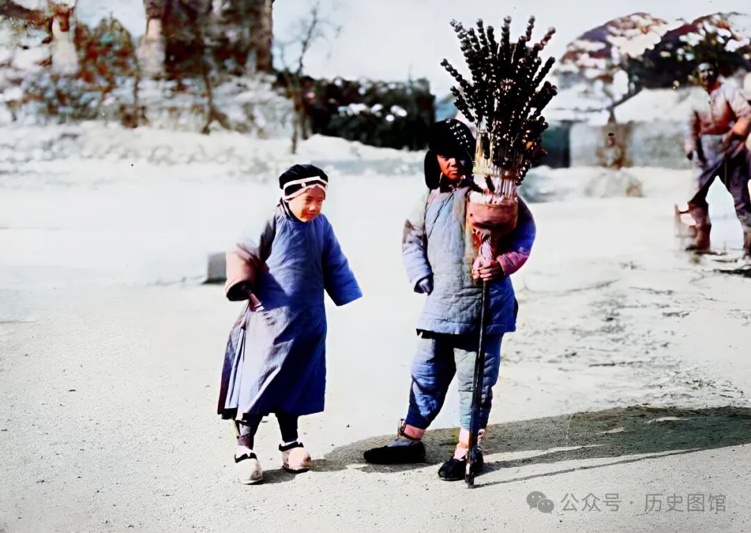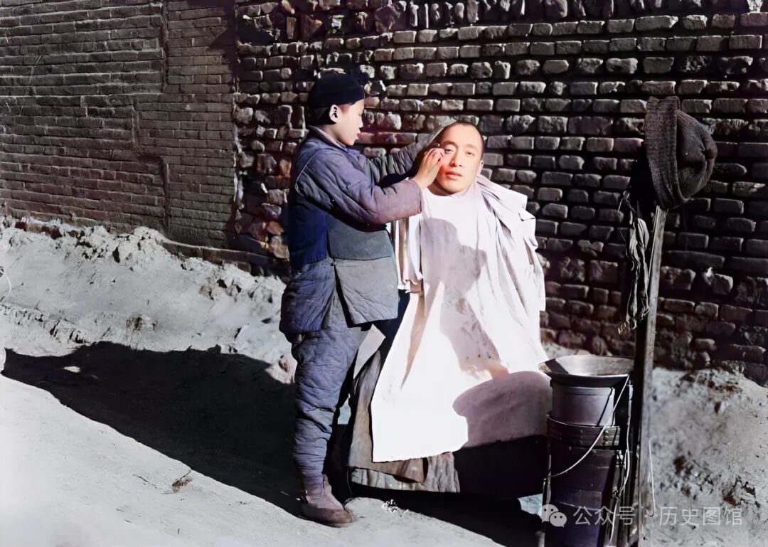 30年代,珲春街边,一名流动理发师,正在为顾客理发。流动理发师一般挑着担子,一头装着理发工具箱,另一头火炉和水盆。