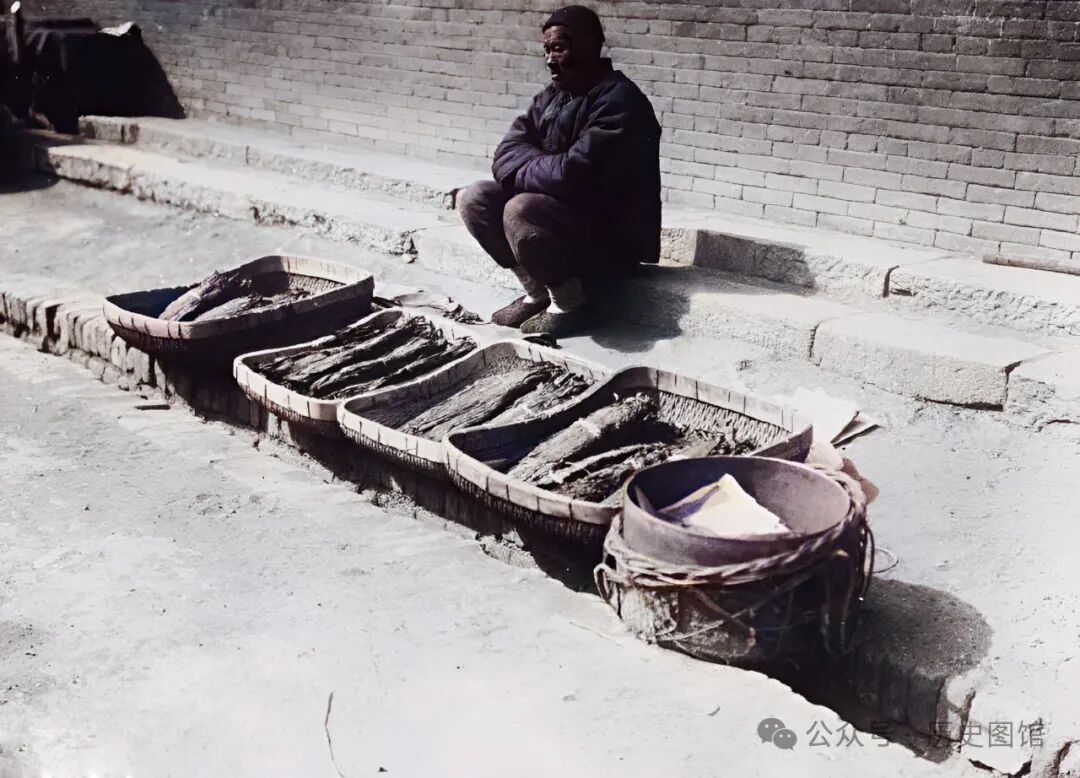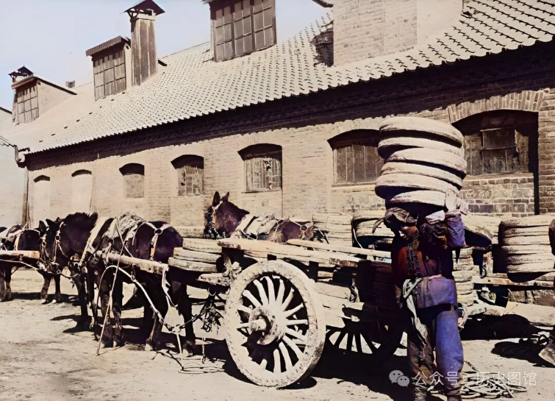 30年代,珲春城内一处仓库前,一名车夫正在从马车上卸货。他肩膀上扛着七八个圆形的东西,他搬运的是豆饼。它是从大豆榨油后的残渣压制而成,豆饼可做饲料,也可以做肥料。从照片上看,附近应该有一个豆饼收购点。