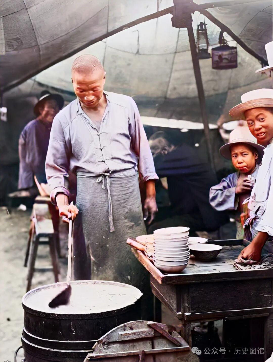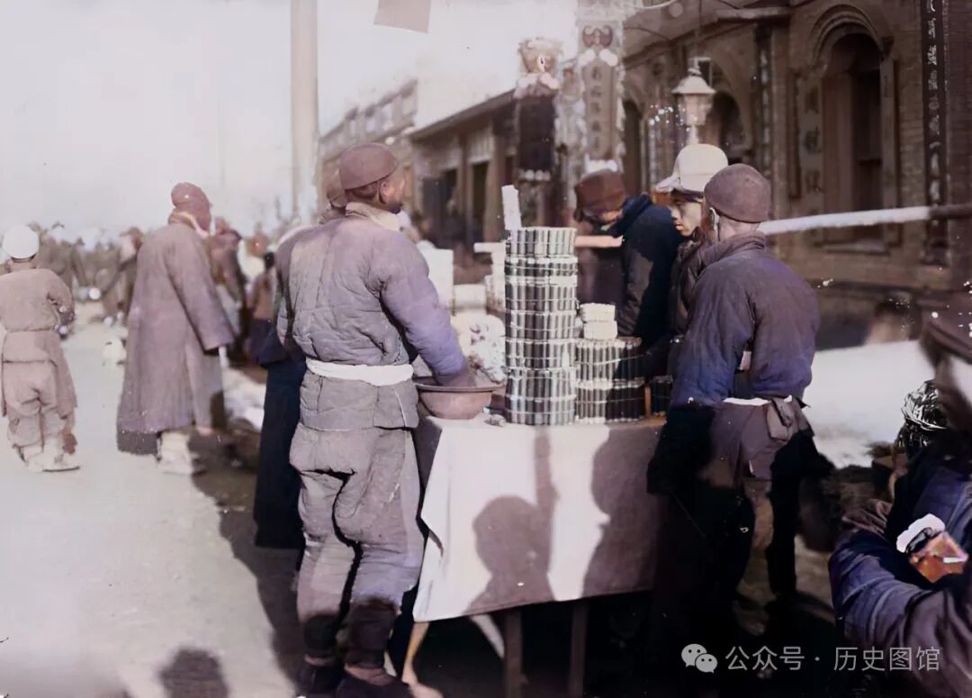 古往今来,每一个城市都有各自独特的人间烟火气,昔日的珲春也不例外。这是位于集市上的一个小吃摊,头顶上撑着遮阳棚。大锅里冒着热气,美食飘香,几名食客被成功吸引了过来。