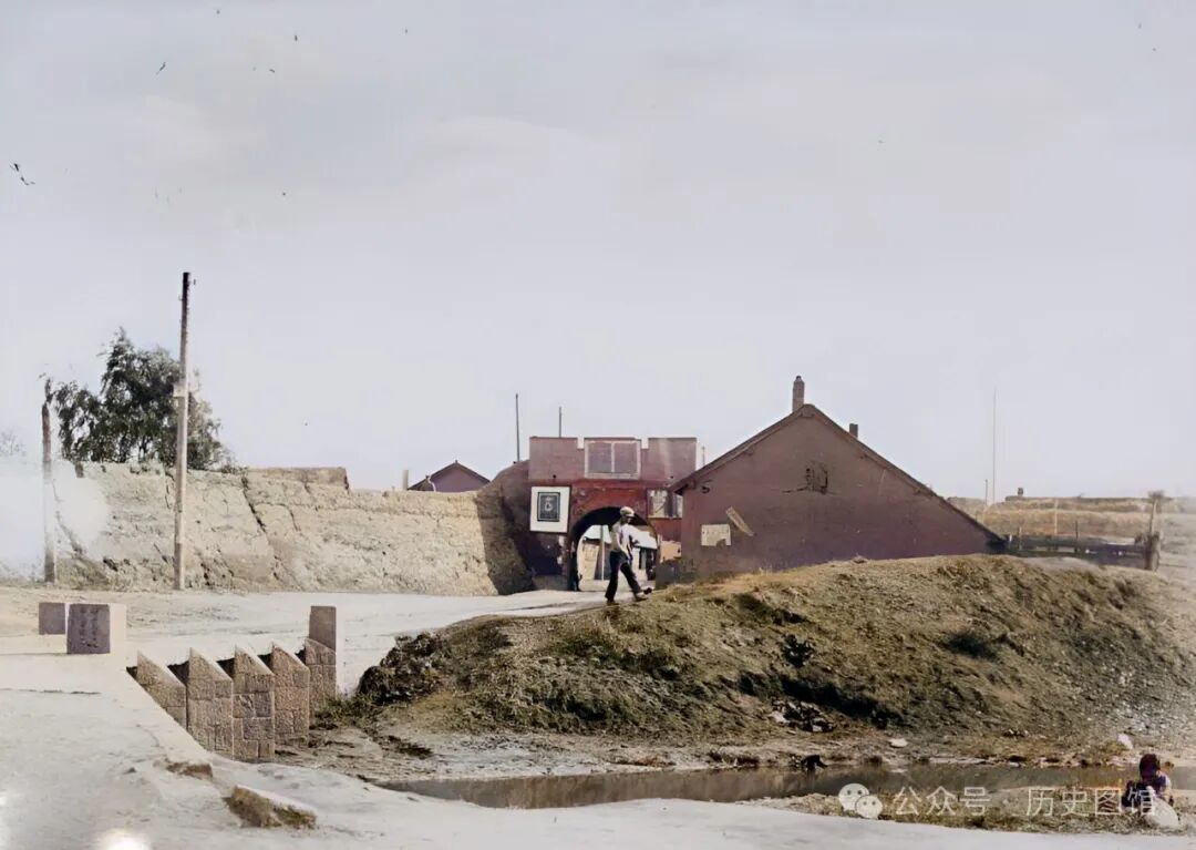 这是珲春城东门外景象。东门靖边门,看上去不是很高大,城门上方也没有城楼。土城墙有3米高。出城不远有一座石桥,护城壕沟里的水几近干涸。一名女子在河边挖野菜。