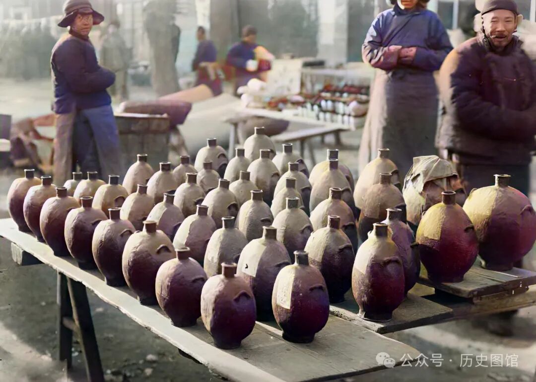 在街边一个摊位上,摆放着一些酒坛一样的容器。它其实是一种容器。但它不是烧制的陶器,而是用柳条编织成酒瓶状,外面糊几层纸,然后用豚油凃在表面。