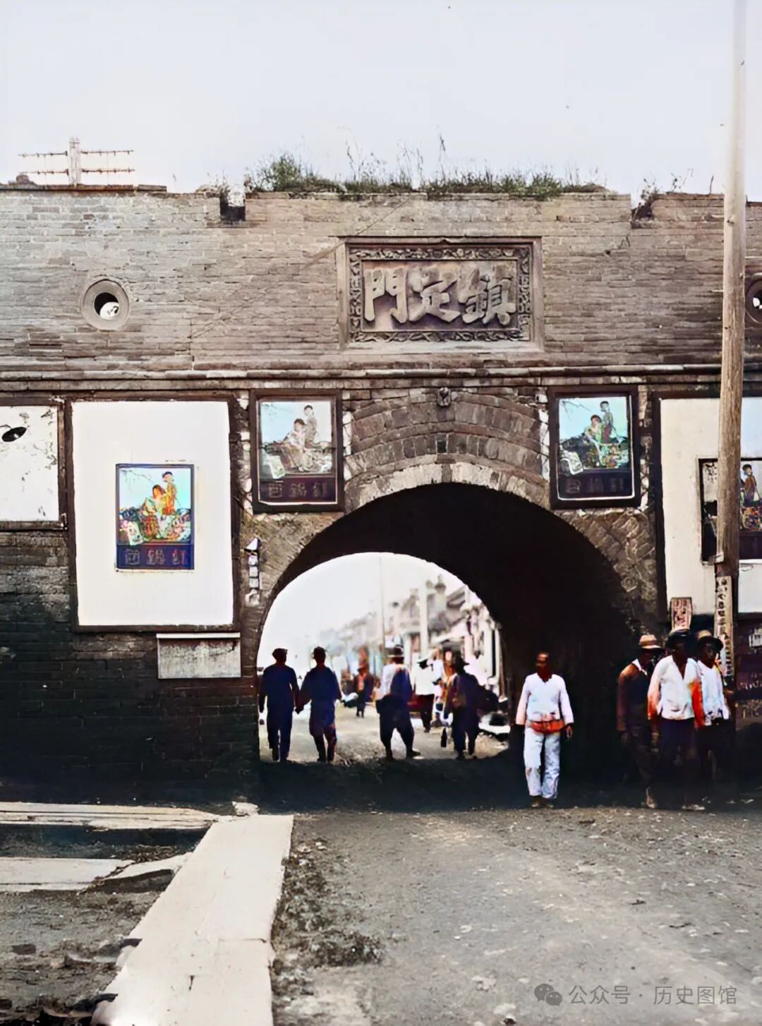 30年代,珲春西城门前景象。门额上“镇定门”三个大字十分醒目。城门宽2丈,深1丈5尺。上部没有城楼,城门口两侧的墙壁上,悬挂着一些香烟广告牌。几位百姓正从门洞中走过。