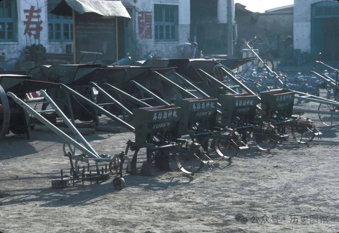 这种播种机需要依靠马匹或牛,前面还设计了一个滚动轮。相对于传统的耧车等播种工具,播种效率要高很多。遵化县农具厂生产的设备,除了播种机,还有脱粒机、除草等先进农机设备。