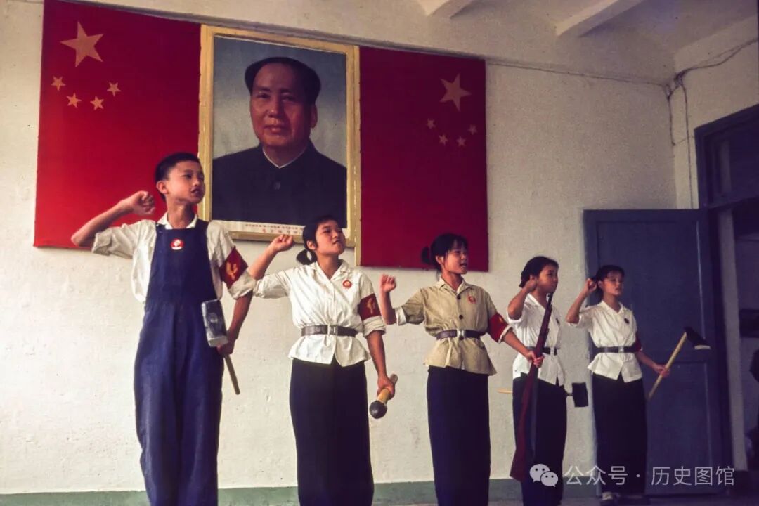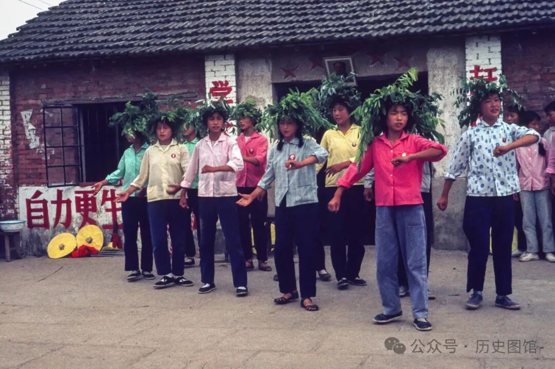 1972年,河北遵化一所中学里,几名学生身穿工农兵服装,表演节目。