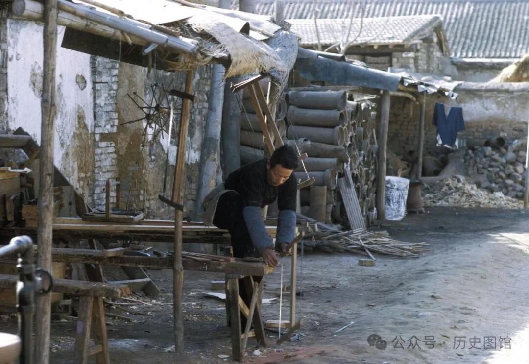 1972年,河北遵化。一名木匠师傅在院子里搭起的简易遮阳棚下忙碌着。手中的锯子上下拉动,木条很快就一分为二。这名木工师傅的工具很多,有些悬挂在棚子上,有些庄子啊工具箱里。
