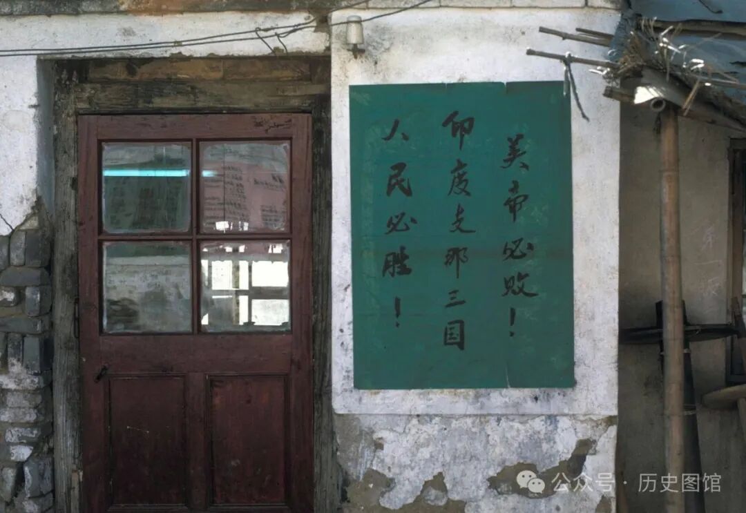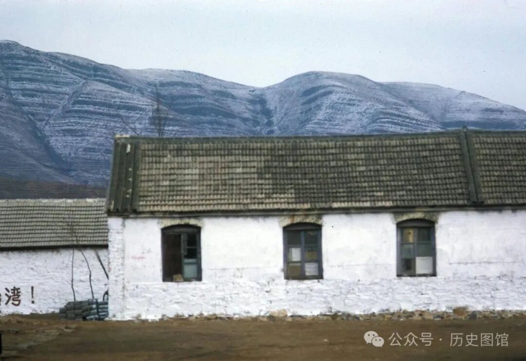 这张照片,看上去像是一个学校的宿舍。墙壁上刷着雪白的石灰。另一栋房子的墙壁上,能看到书写有巨大的标语。远处山峦起伏,山上开辟有梯田,看上去令人震撼。