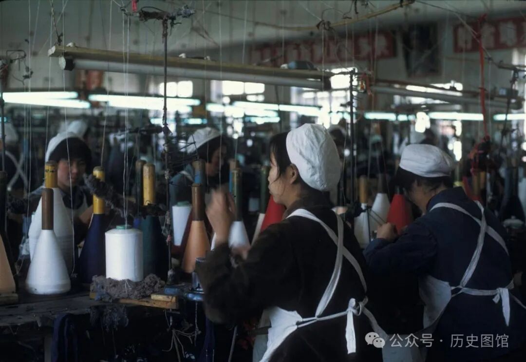 厂房的窗户上方,巨大的安全生产标语十分醒目。机器转动,洁白的的纱锭慢慢成型。女工们工作认真,一丝不苟,外国摄影师拍下了这张照片。