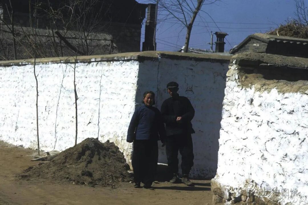 1972年,在河北遵化一个村子里,一对老夫妻站在墙角。他们穿着蓝色的棉衣,朴实慈祥。