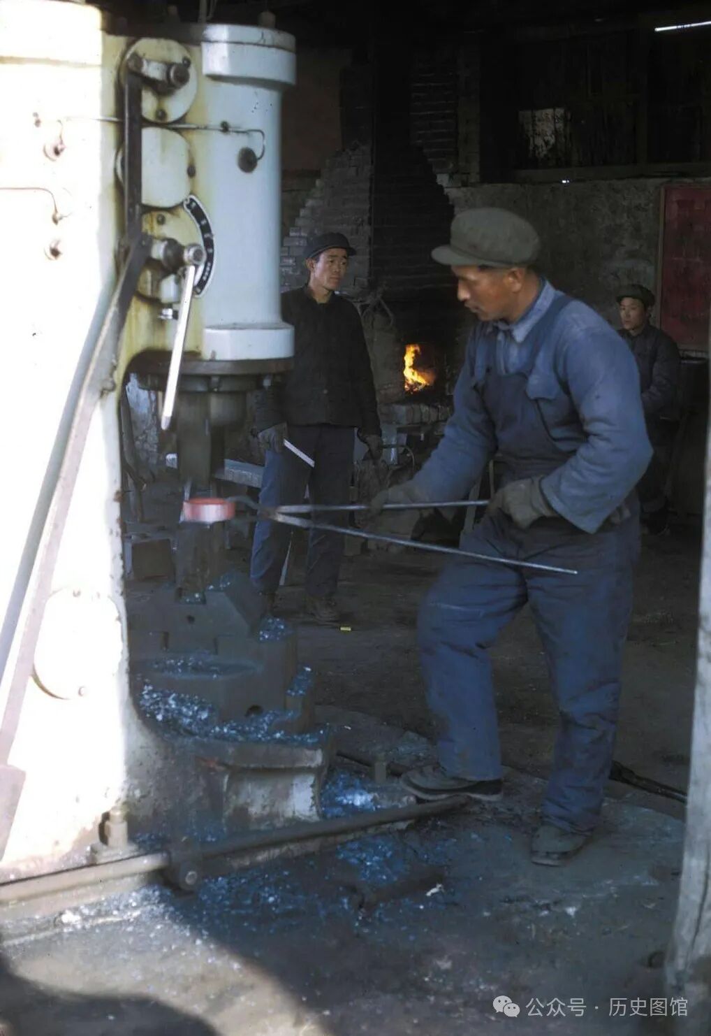 工人师傅用铁钳夹住一块烧得通红的铁块,经过他的精雕细琢,最终成为合格的机器零件。从他们的工作状态看,每个人都充满了主人翁责任感和无限的热情。