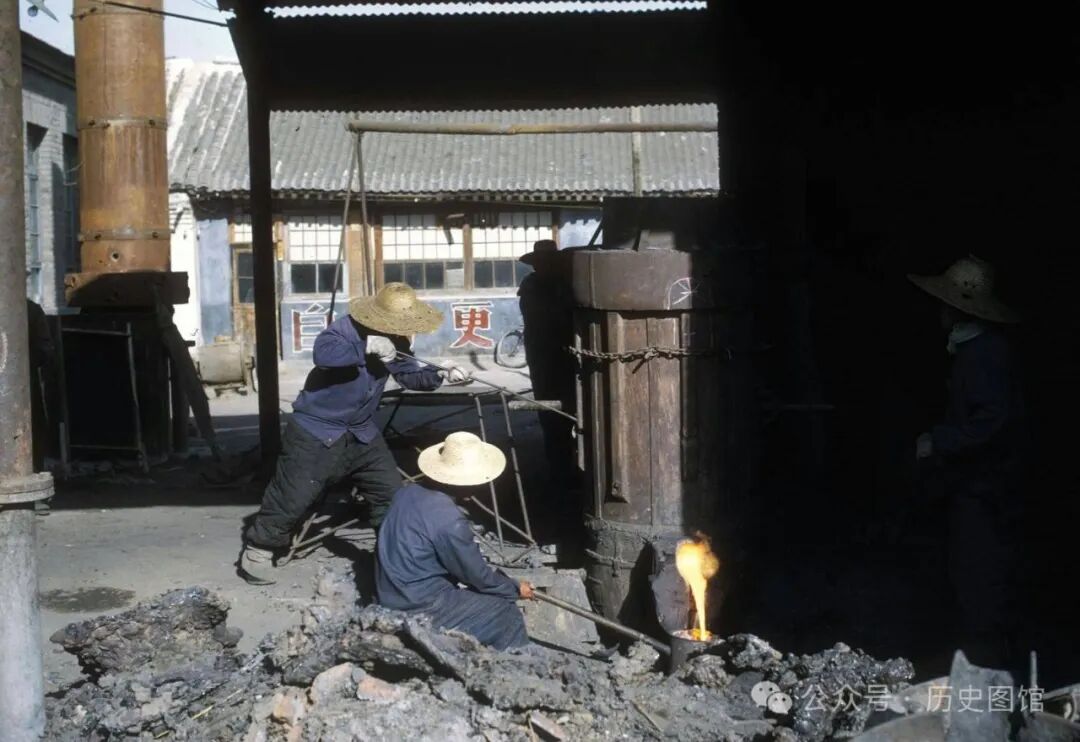 这中小型的炼钢炉里融化的铁水,主要是用来浇筑一些简单的农机具构件。厂房的墙壁上能看到“自力更生”字样的标语。