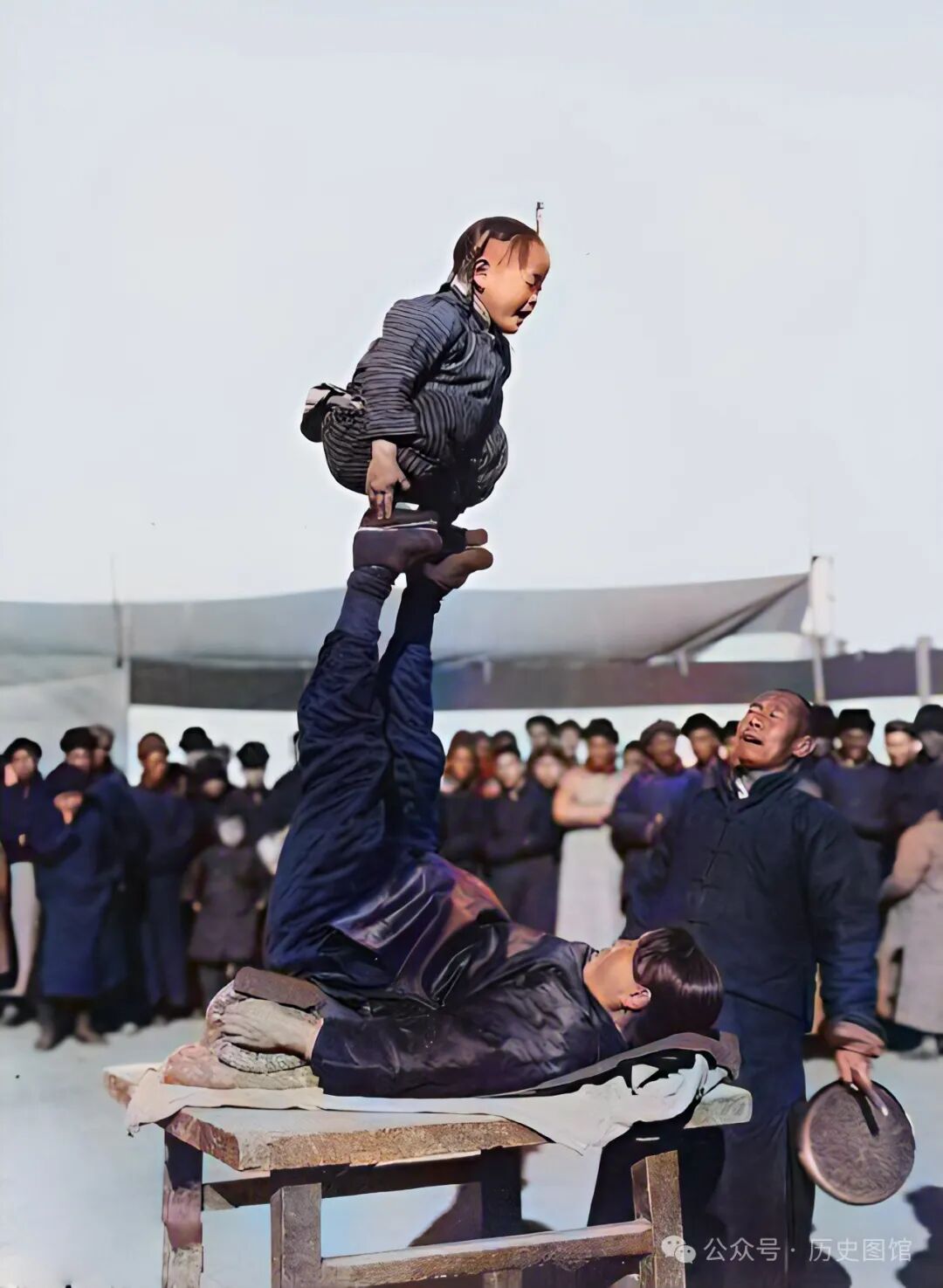 30年代,在义县的庙会上,几名江湖艺人正在表演杂技。一名女子躺在木桌上,双腿朝上,一名孩子站在她的脚上。女子的丈夫站在旁边敲锣,并时刻保护着母女两人做高难度动作。