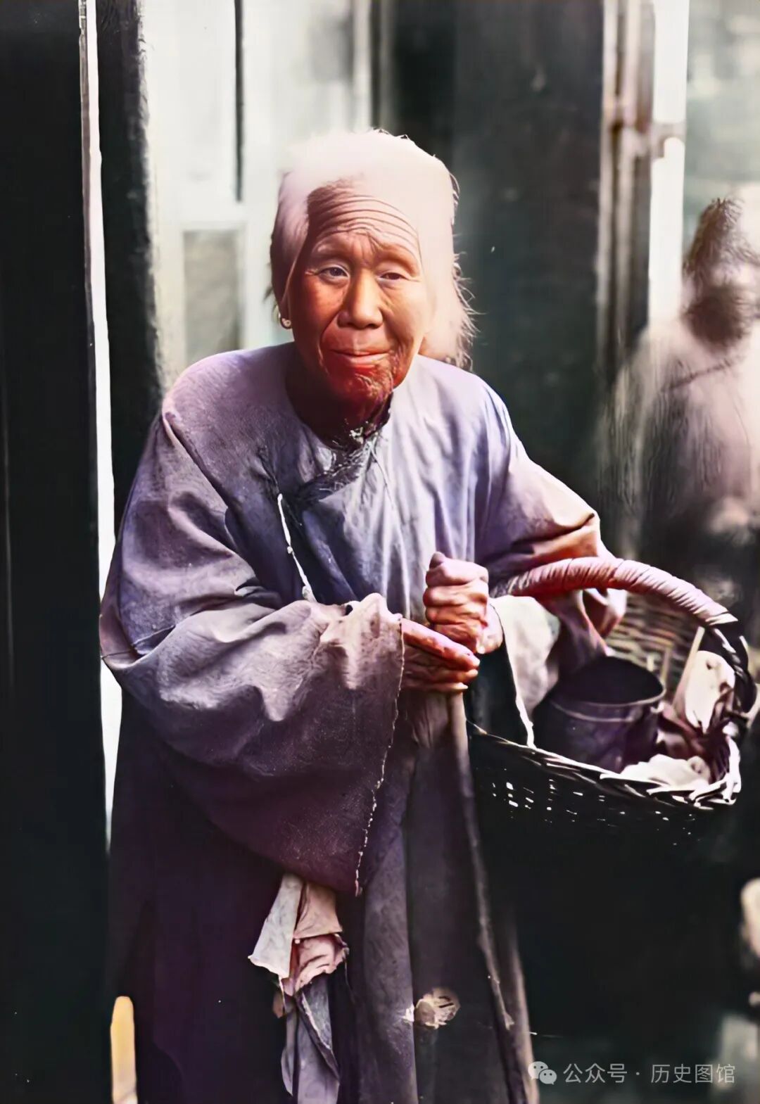 30年代,义县街头,一名乞丐站在路边。老太太满头白发衣衫褴褛,手拿拐杖挎着竹篮,竹篮里有一只碗。这就是她的全部家当了。看上去真是太可怜了!