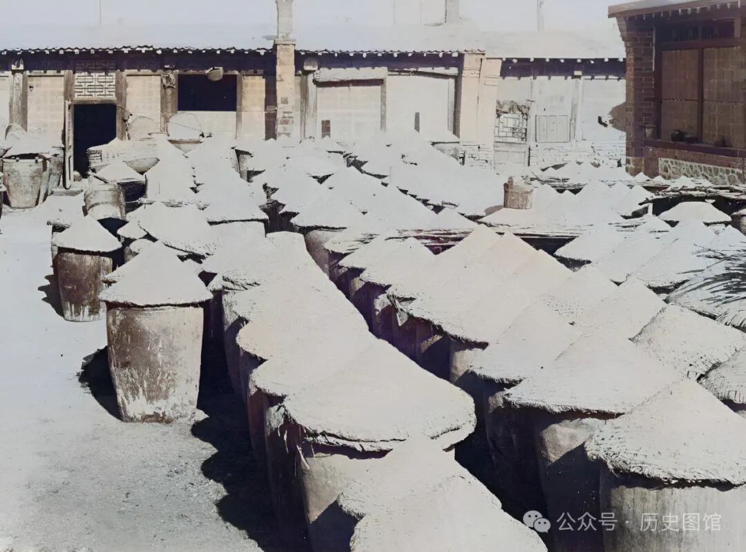 30年代,义县城内一处腌咸菜作坊。院子里摆满了咸菜坛,坛子里装着的是各式各样的咸菜。