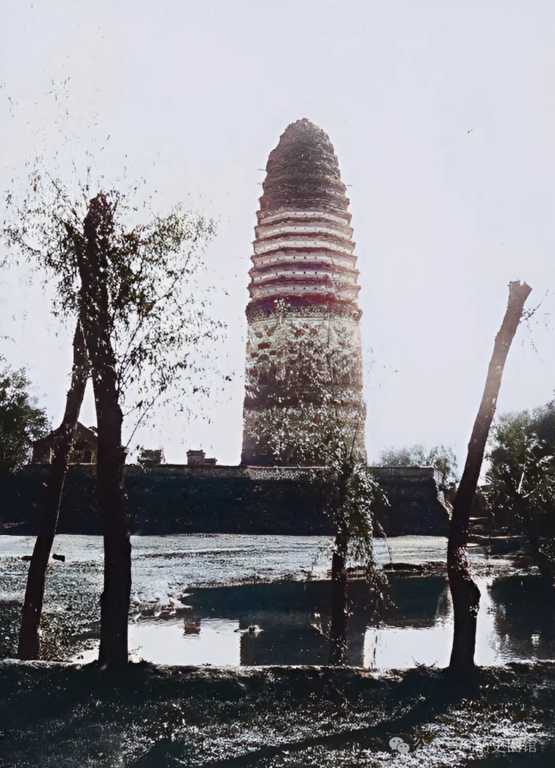 这是从另一个角度仰望广胜寺塔。寺院墙外,有一个水塘,古塔倒映在水中,美轮美奂。