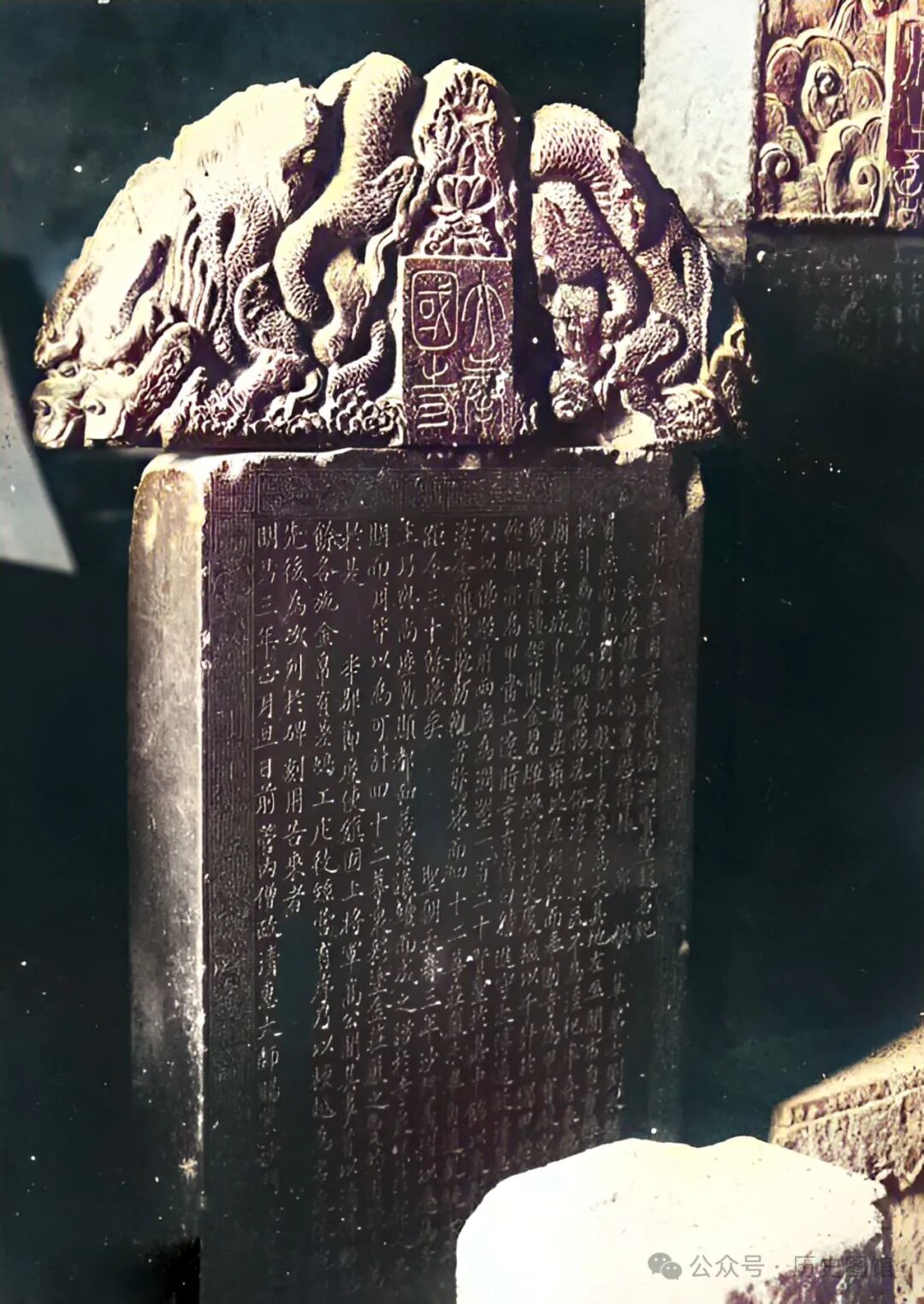 这是位于奉国寺内的一块碑刻。石碑顶部碑帽,雕刻有数条飞龙。上有四个字“大奉国寺”。碑文雕刻清晰,字体浑厚。处处体现着皇家寺院的高贵。