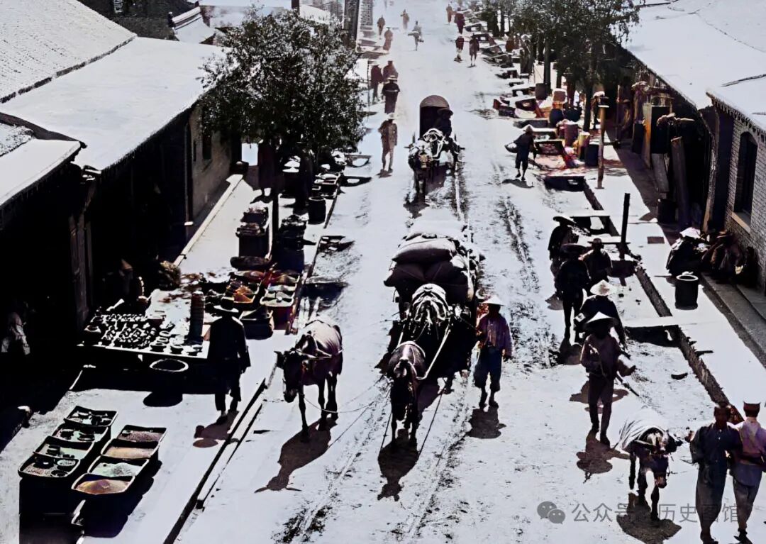 30年代,义县城内一条热闹的街道。路面是泥泞的土路,能看到马车压过的车辙。街道两侧店铺都在开门营业,有些商家把商品摆在路边售卖。