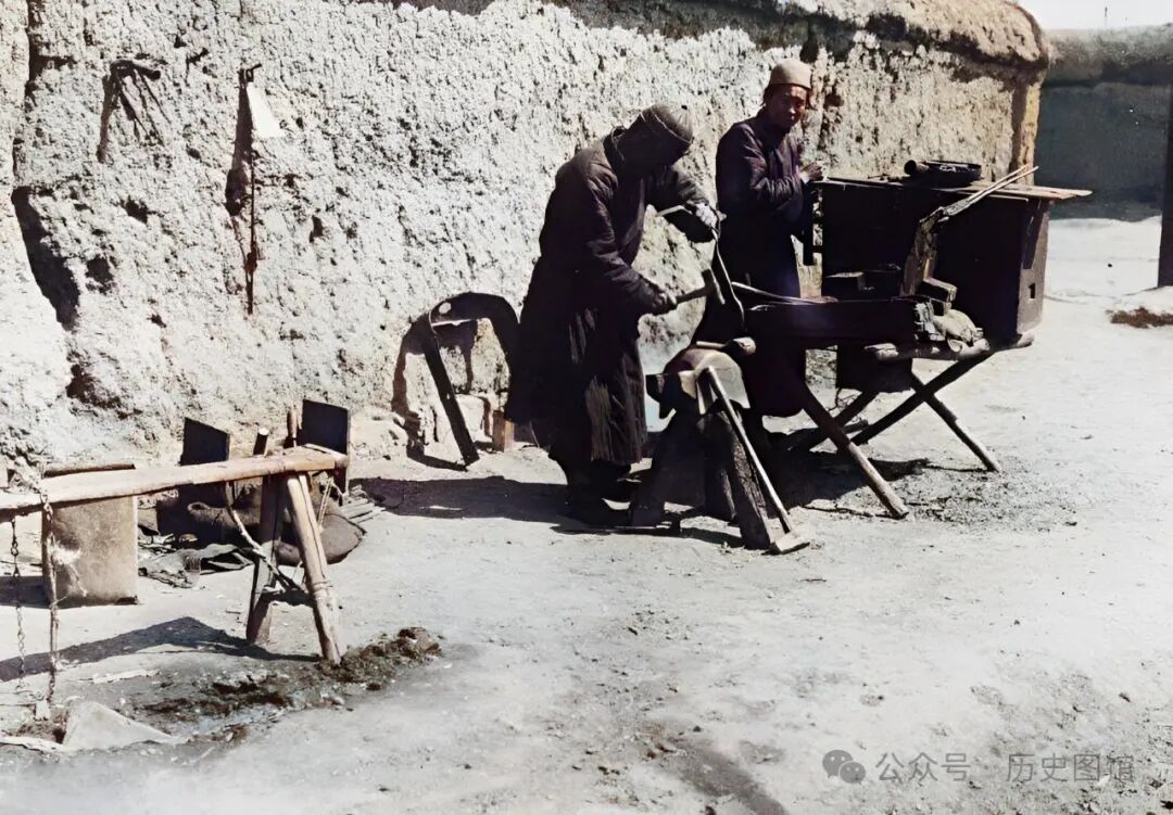 在义县街头,有一个露天铁匠铺。两名男子正在举着锤子,击打被烧得火红的铁块。靠墙的地方建有火炉。打铁也是一门手艺,依靠这个也能养家糊口。