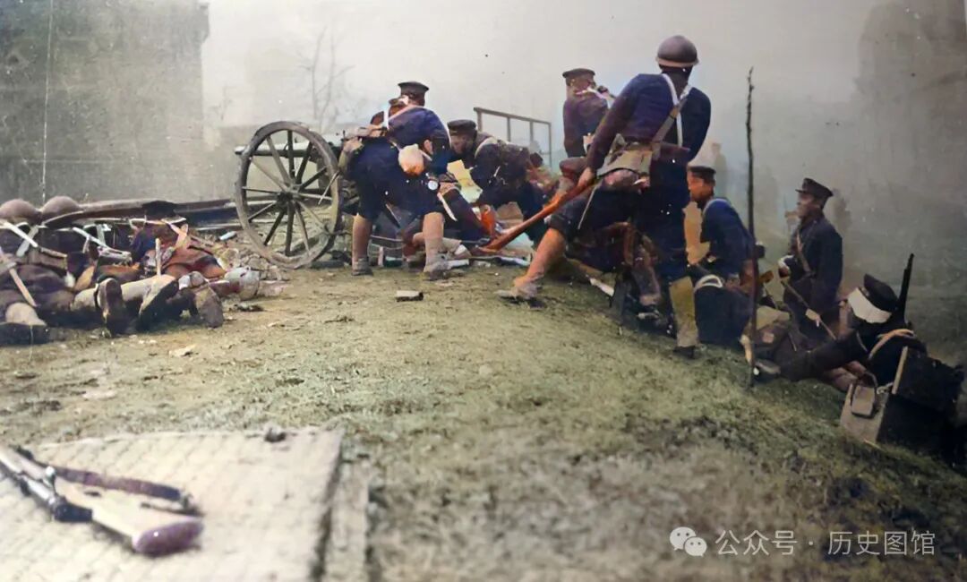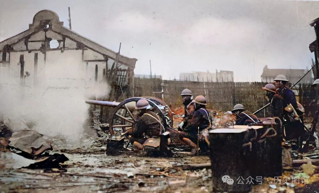 这张照片,也是拍摄于虬江路附近,日军一支炮兵部队正在同中国军队激战。背景里的房屋,只剩了一面山墙。地面上到处是碎砖瓦砾,可见当时战斗的激烈程度。