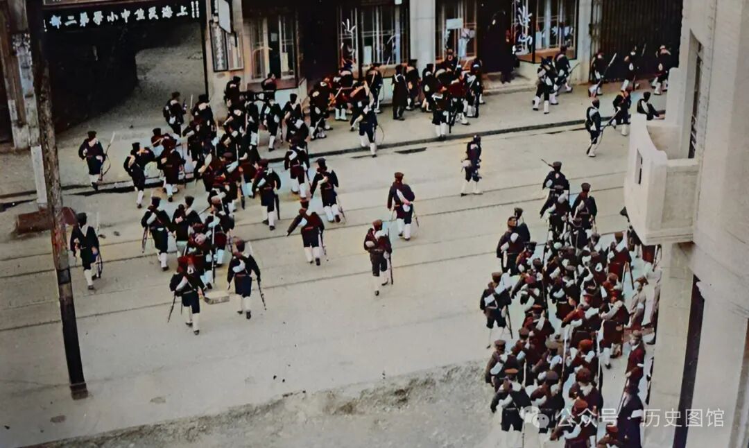 北四川路上,突然出现一大群日军便衣队士兵,他们迅速涌向一座大楼,进入并开始搜索中国守军的踪迹。照片左上角,大门上方能看到“上海民生中小学第二部”几个大字。
