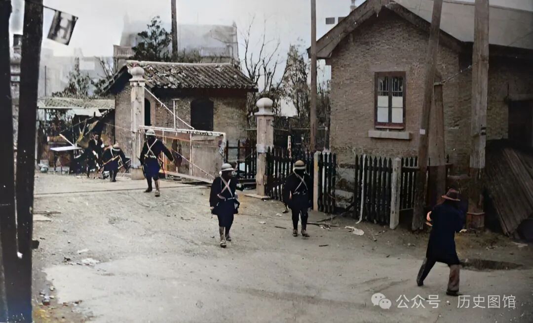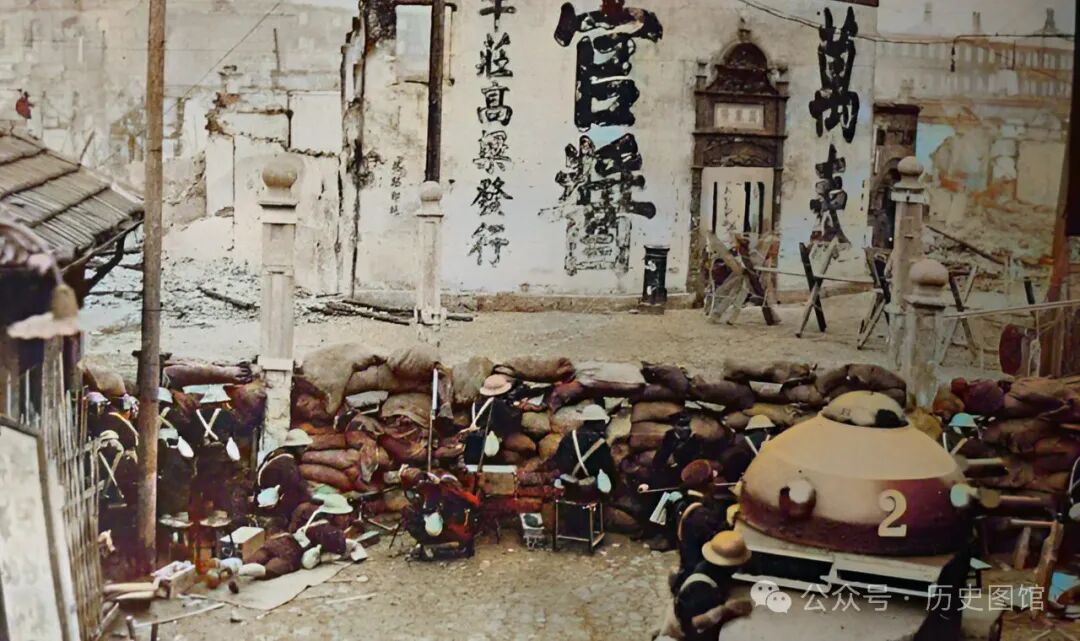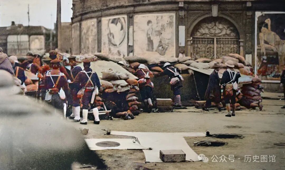 日军一支部队,在上海街头日军阵地前,设置障碍拉起铁丝网。仔细看,他们身后的建筑,早已成了断壁残垣,门窗不翼而飞,地上到处是瓦砾。